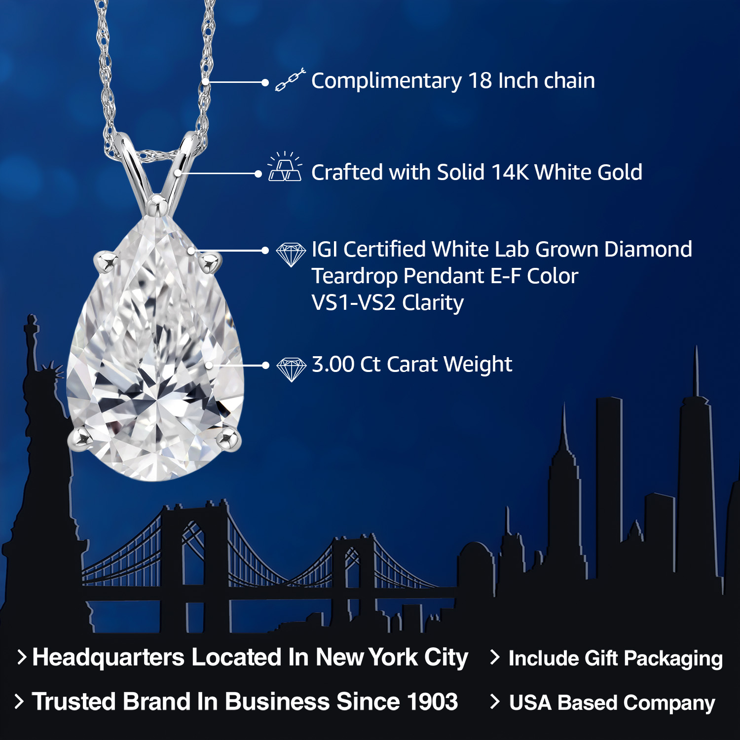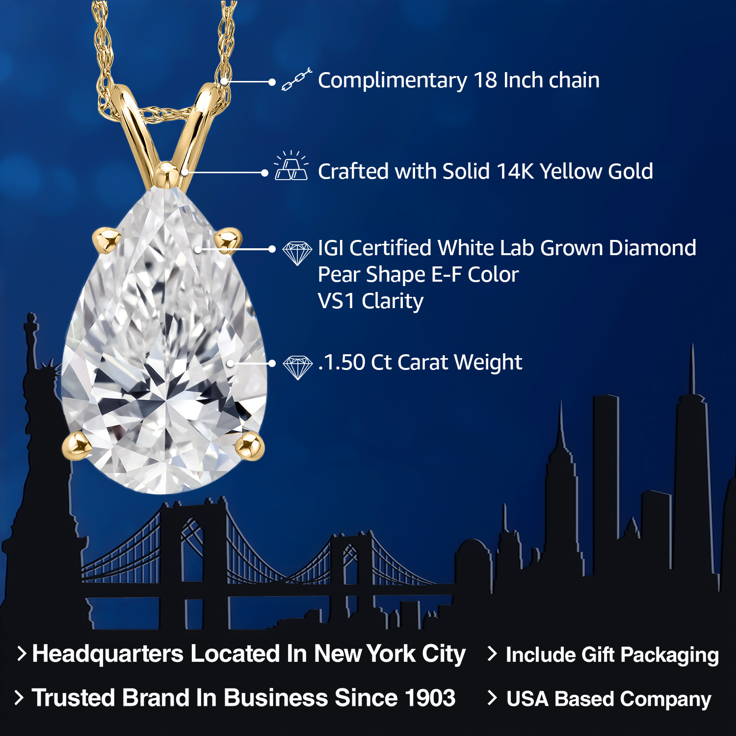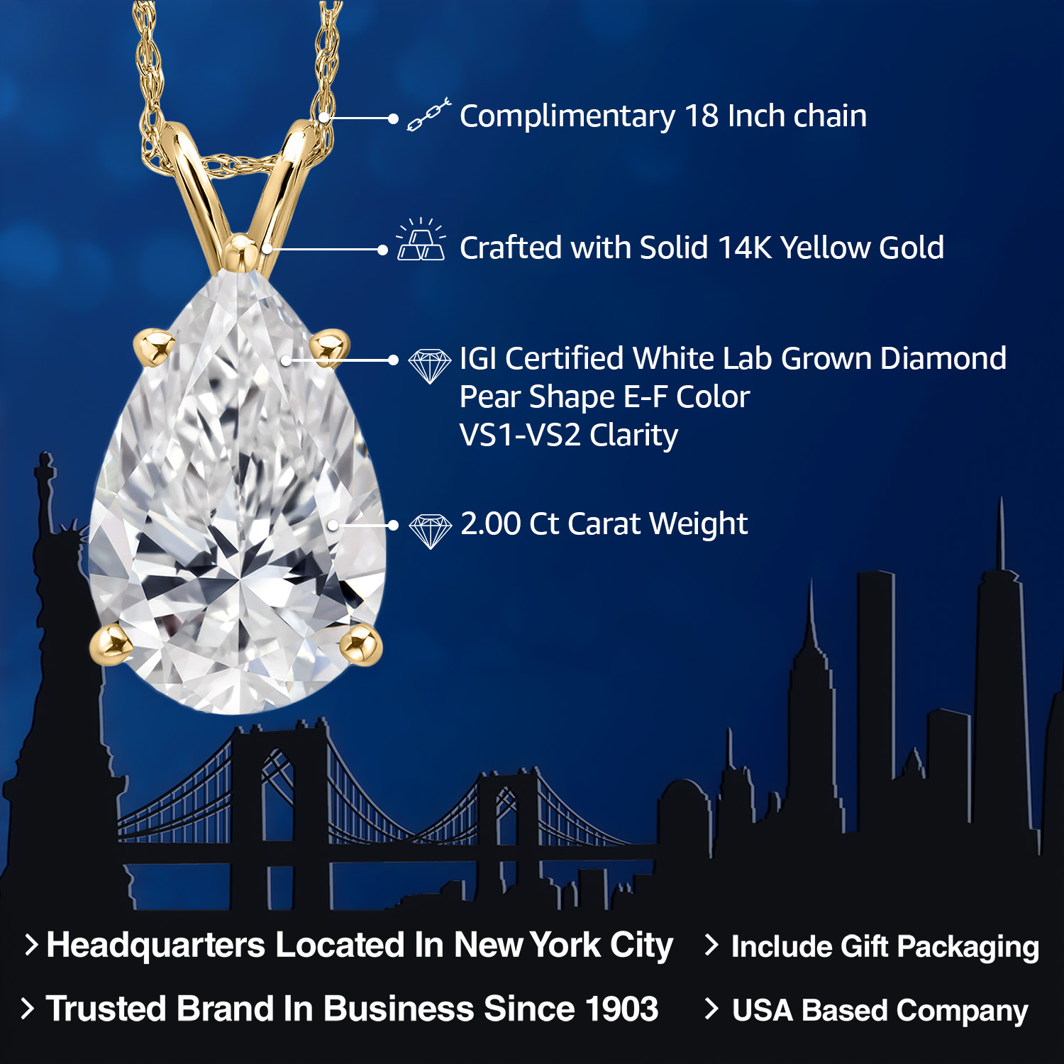 0.70-5 Cttw IGI Certified Lab Grown Diamond 14K Gold Teardrop Pendant Necklace For Women | Pear Shape | E-F Color | VS1-VS2 Clarity | With 18 Inch Gold Chain