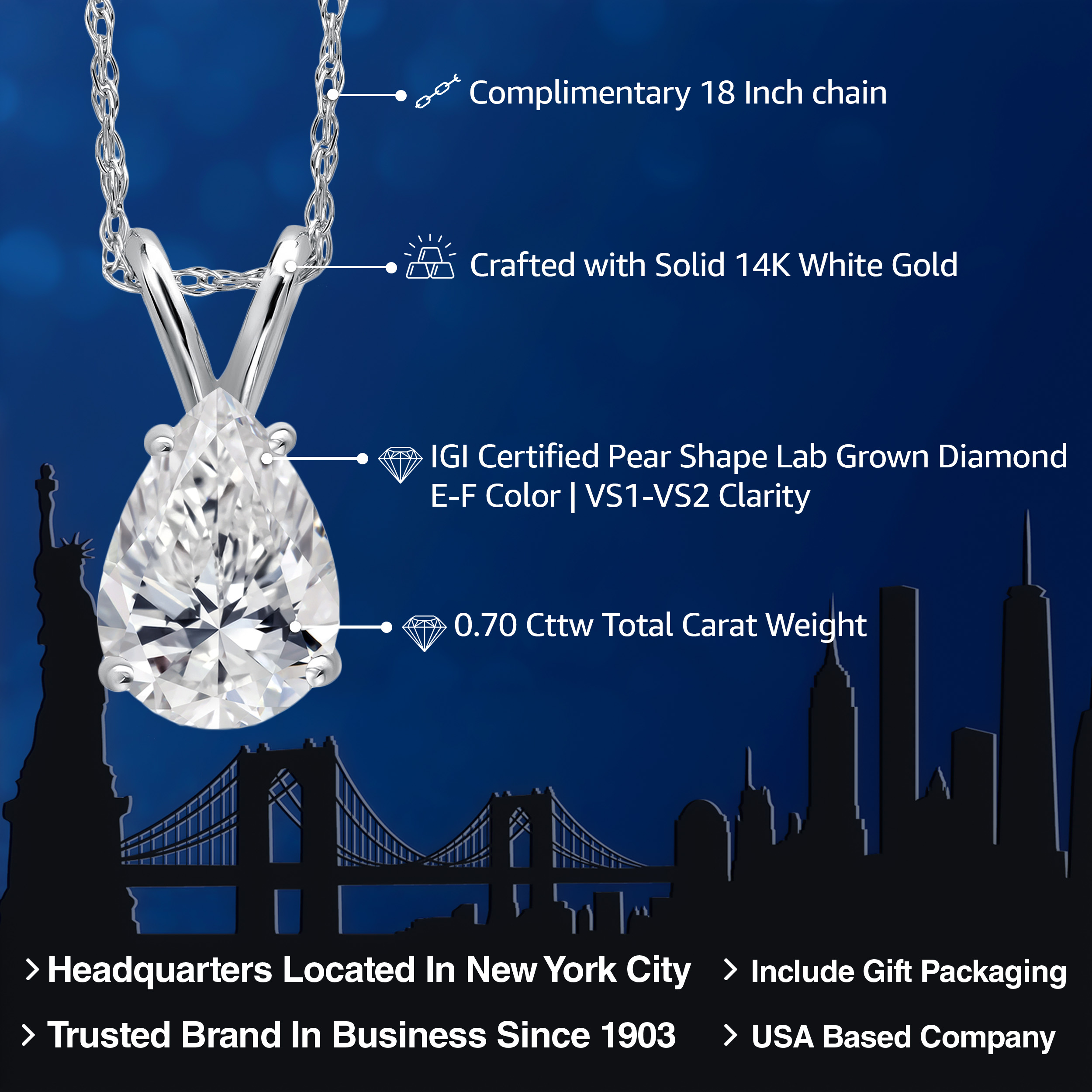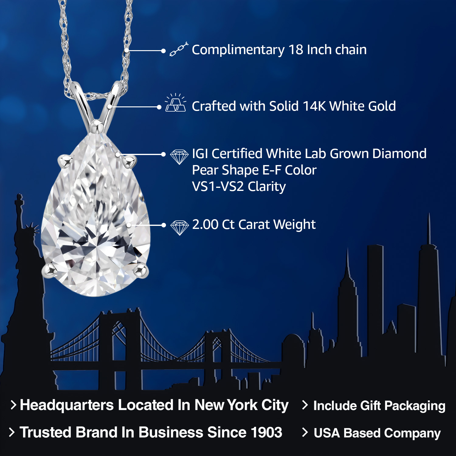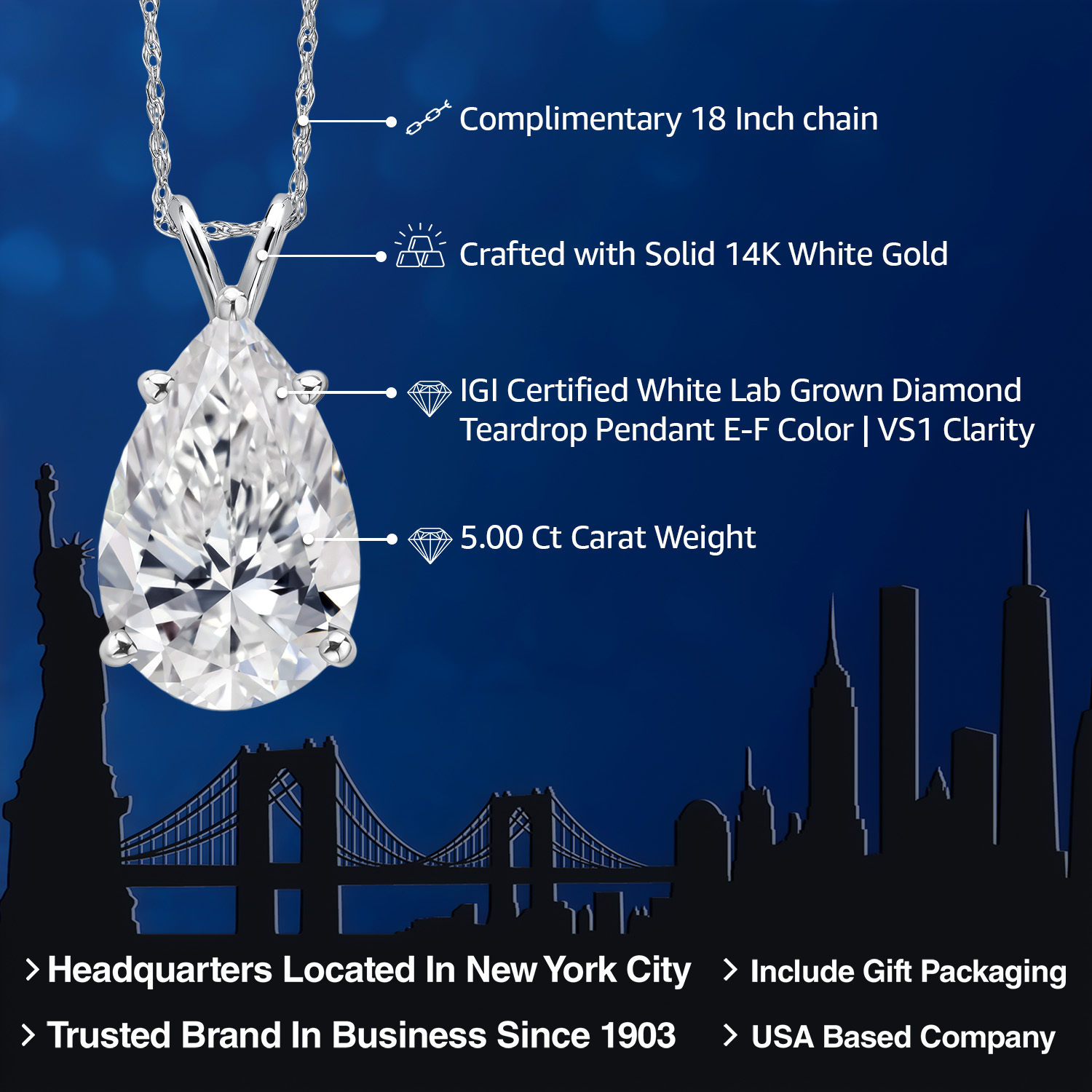 0.70-5 Cttw IGI Certified Lab Grown Diamond 14K Gold Teardrop Pendant Necklace For Women | Pear Shape | E-F Color | VS1-VS2 Clarity | With 18 Inch Gold Chain
