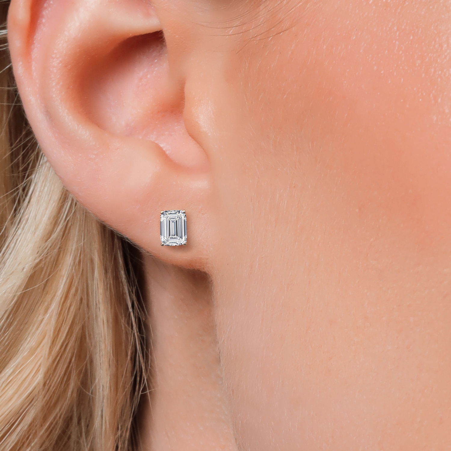 TIMELESS DESIGN: Featuring elegant emerald cut 9x7MM diamonds in a classic basket setting, these earrings provide a timeless and sophisticated look, perfect for any occasion.