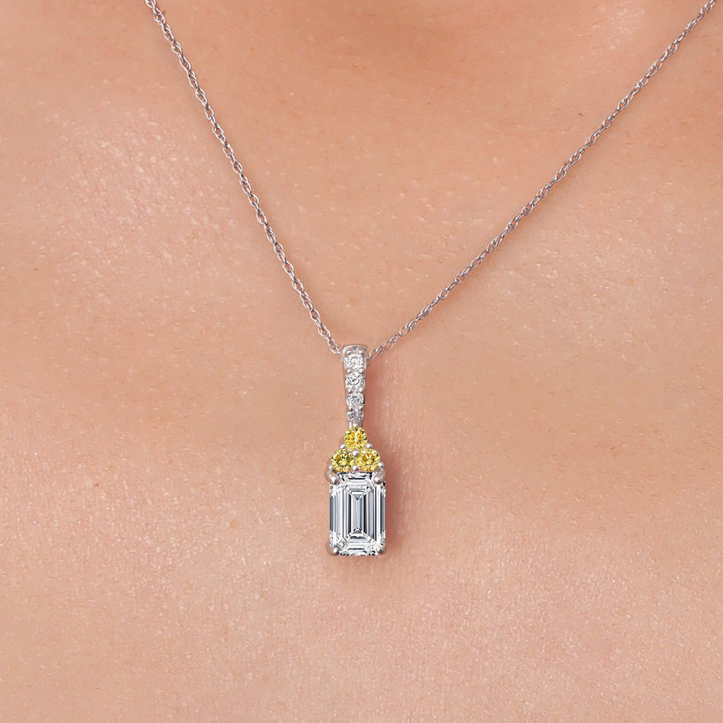 CAPTIVATING CENTER STONE: The centerpiece of the necklace is a 6X4MM emerald-cut E-F VS1-VS2 lab-grown diamond.