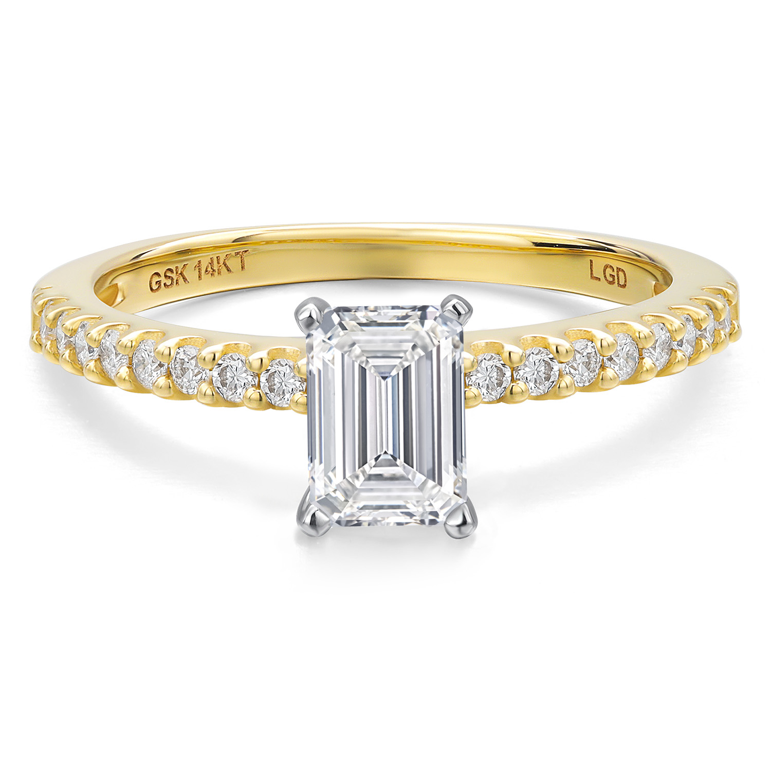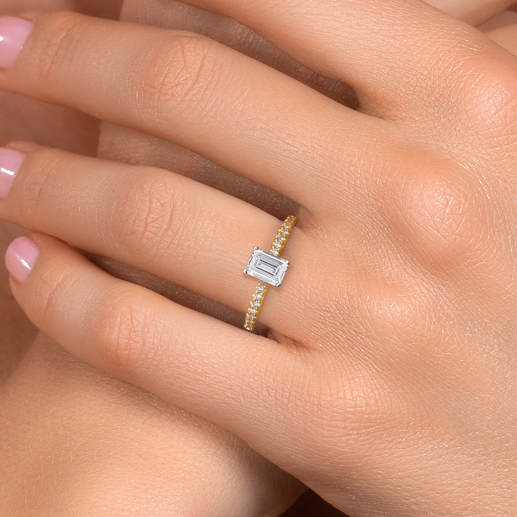 TOTAL 0.91 CTTW EMERALD CUT DIAMOND RING: This ring features a 0.75-carat IGI-certified emerald-cut lab-grown diamond with E–F color and VS1–VS2 clarity. Its refined step-cut facets create mirror-like depth and radiance, with accent stones bringing the total to 0.91 carats.