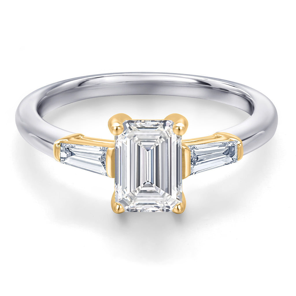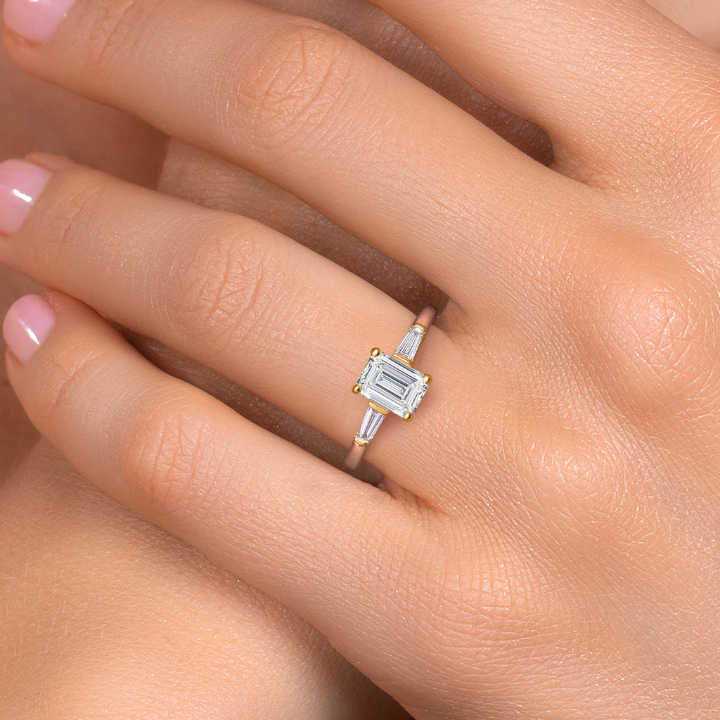 MEASUREMENTS: 7x5mm Emerald Cut E - F Lab Grown Diamond, 4.5x2mm Tapered Baguette E - F Lab Grown Diamond. Total Carat Weight is 1.2 cttw