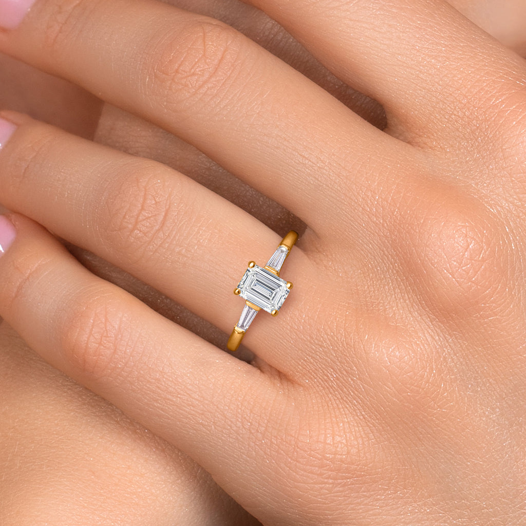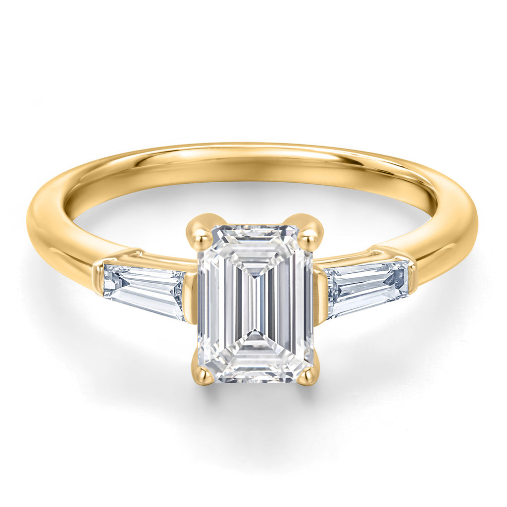 ROUND AND BAGUETTE LAB GROWN DIAMOND GEMSTONES: This exquisite engagement ring features a 1-carat round IGI certified lab grown diamond accented by tapered baguette side stones, totaling 1.20 carats. Each diamond showcases E-F color and VS1 clarity for exceptional brilliance.