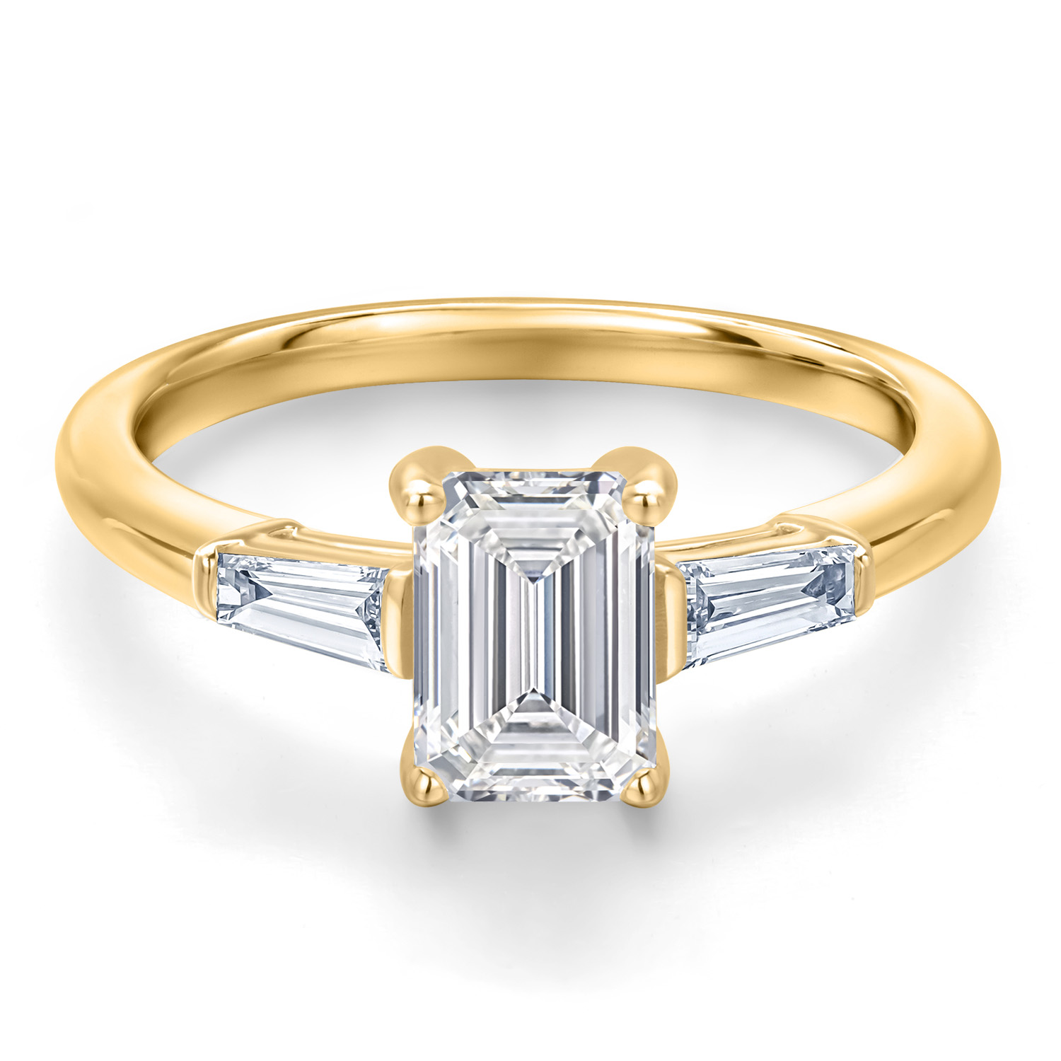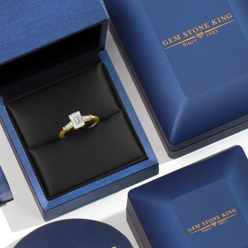 CLASSIC THREE-STONE DESIGN: The round center diamond is beautifully framed by sleek tapered baguette sides, symbolizing past, present, and future love. Each diamond is expertly cut and securely set, reflecting fine craftsmanship and balance.
