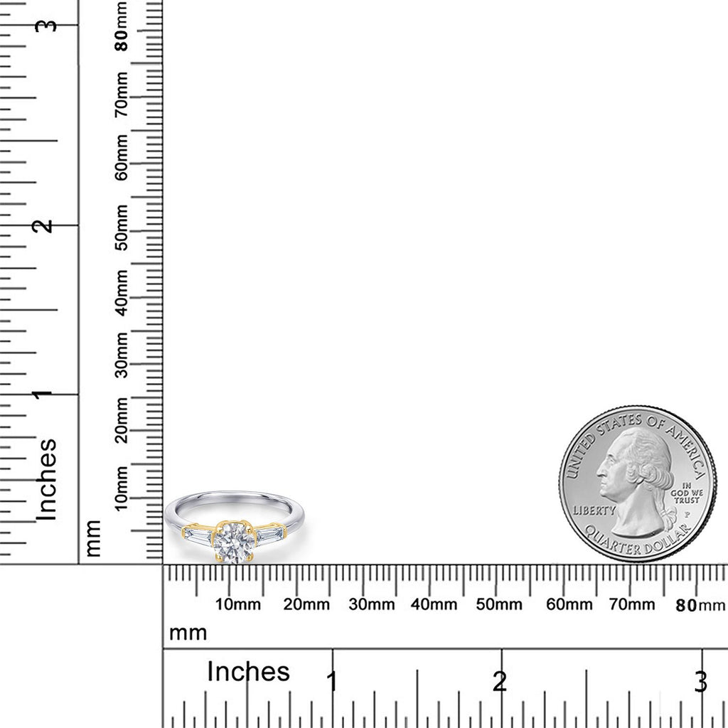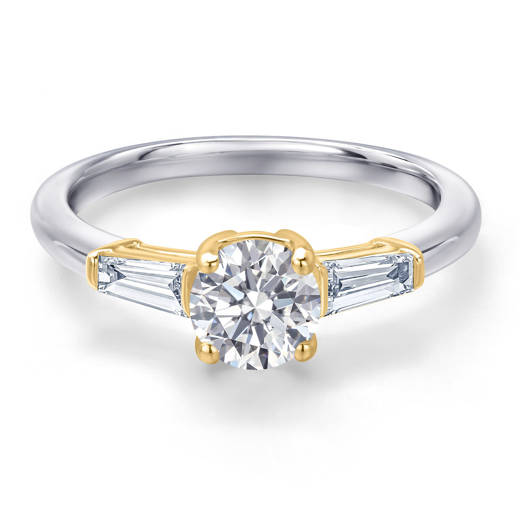 MEASUREMENTS: 6x6mm Round E - F Lab Grown Diamond, 5x2.25mm Tapered Baguette E - F Lab Grown Diamond. Total Carat Weight is 1.05 cttw