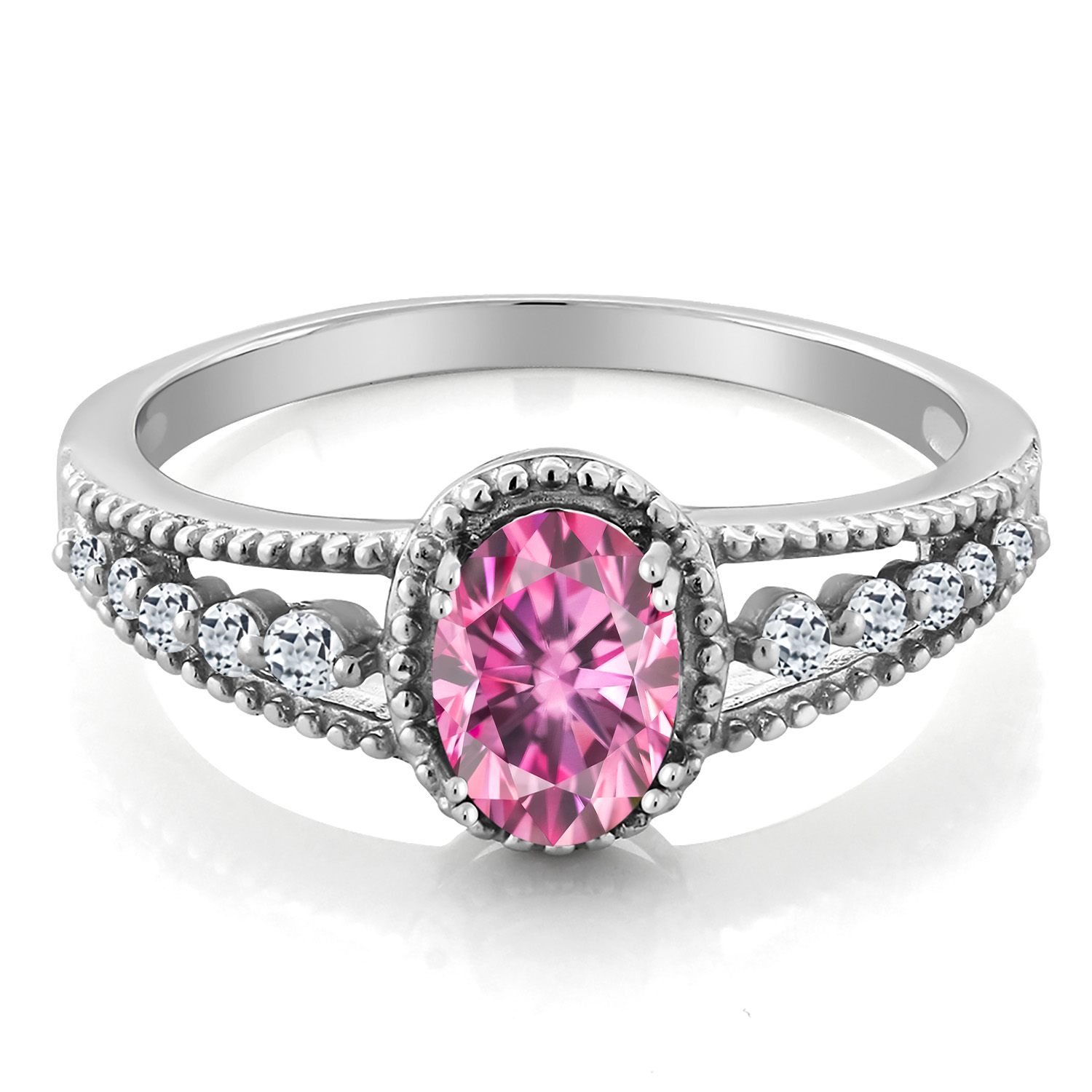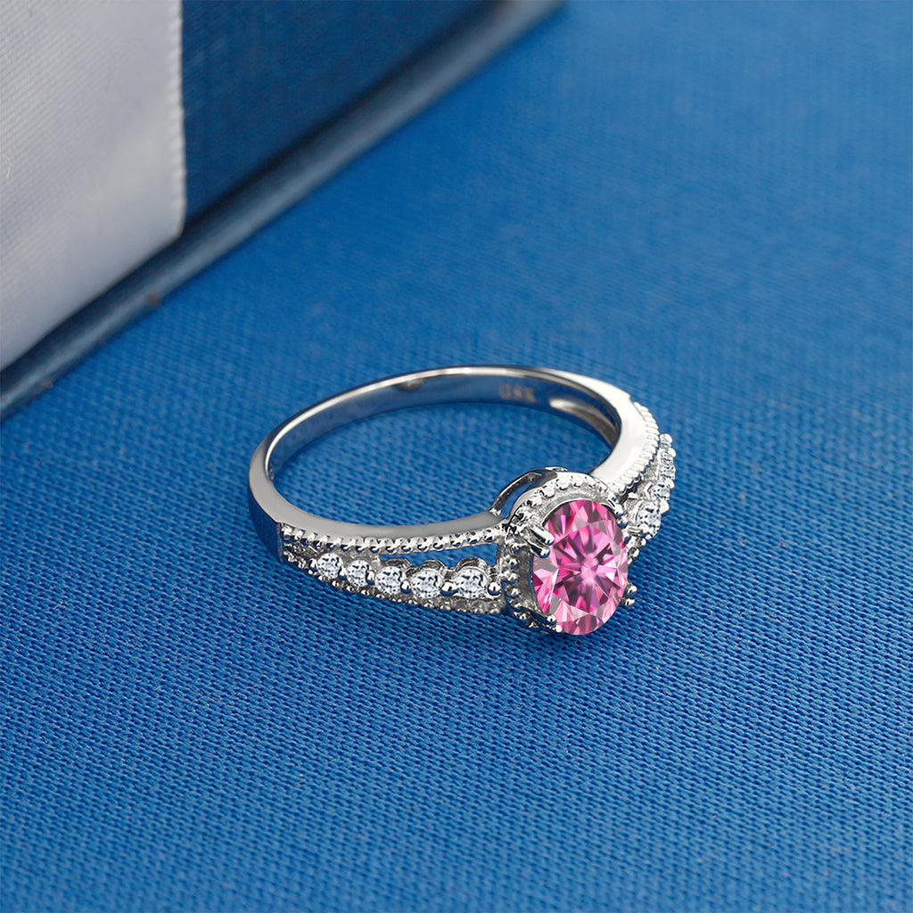MEASUREMENTS: 7x5mm Oval Coated Pink Moissanite, 1.8x1.8mm Round White Topaz1.5, x, 1.5, mm Round White Topaz. Total Carat Weight is 1.11 cttw