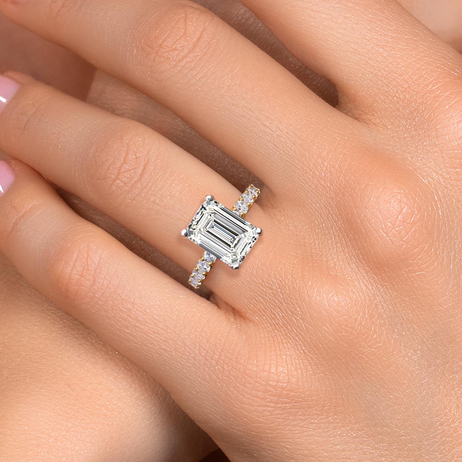 IGI-CERTIFIED EMERALD DIAMOND BRILLIANCE: Featuring center diamonds ranging from 0.75 to 5.00 carats, this ring showcases the refined beauty of the emerald cut, paired with IGI-certified E–F color and VS1–VS2 clarity. An added 0.38 ct of accent diamonds enhances the total sparkle.