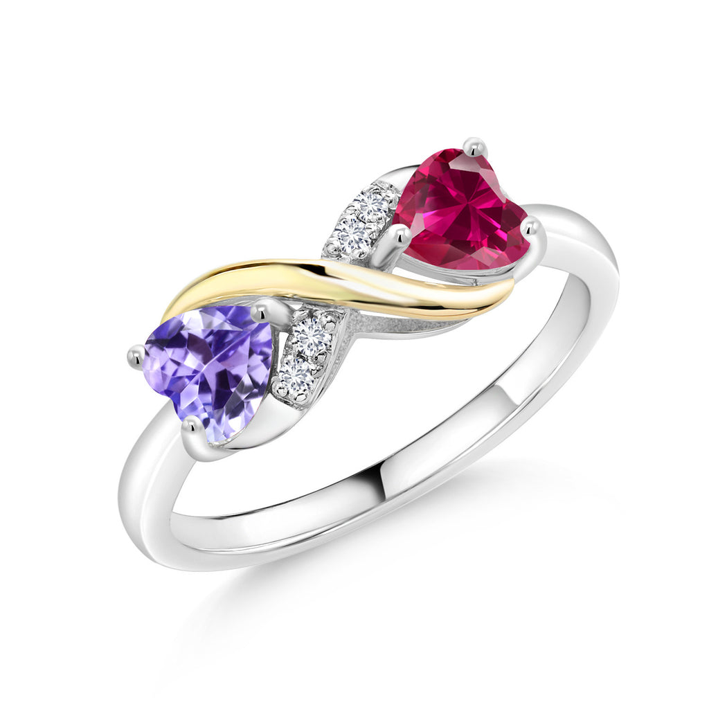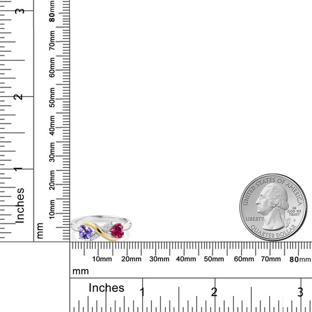 MEASUREMENTS: 5x5mm Heart Shape Heat-Treated Blue Tanzanite, 5x5mm Heart Shape Heat-Treated Red Created Ruby1.3, x, 1.3, mm Round E - F Lab Grown Diamond. Total Carat Weight is 1.14 cttw