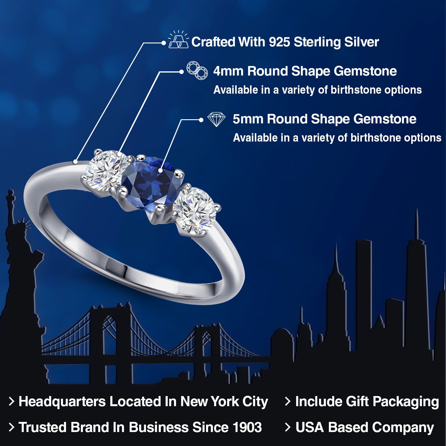 THREE-STONE SPARKLE: Showcases a stunning 5x5mm round heat-treated blue created sapphire alongside a brilliant 4x4mm EF lab grown diamond, totaling 1.14 carats. The vibrant blue and pure white stones symbolize loyalty, clarity, and eternal love.