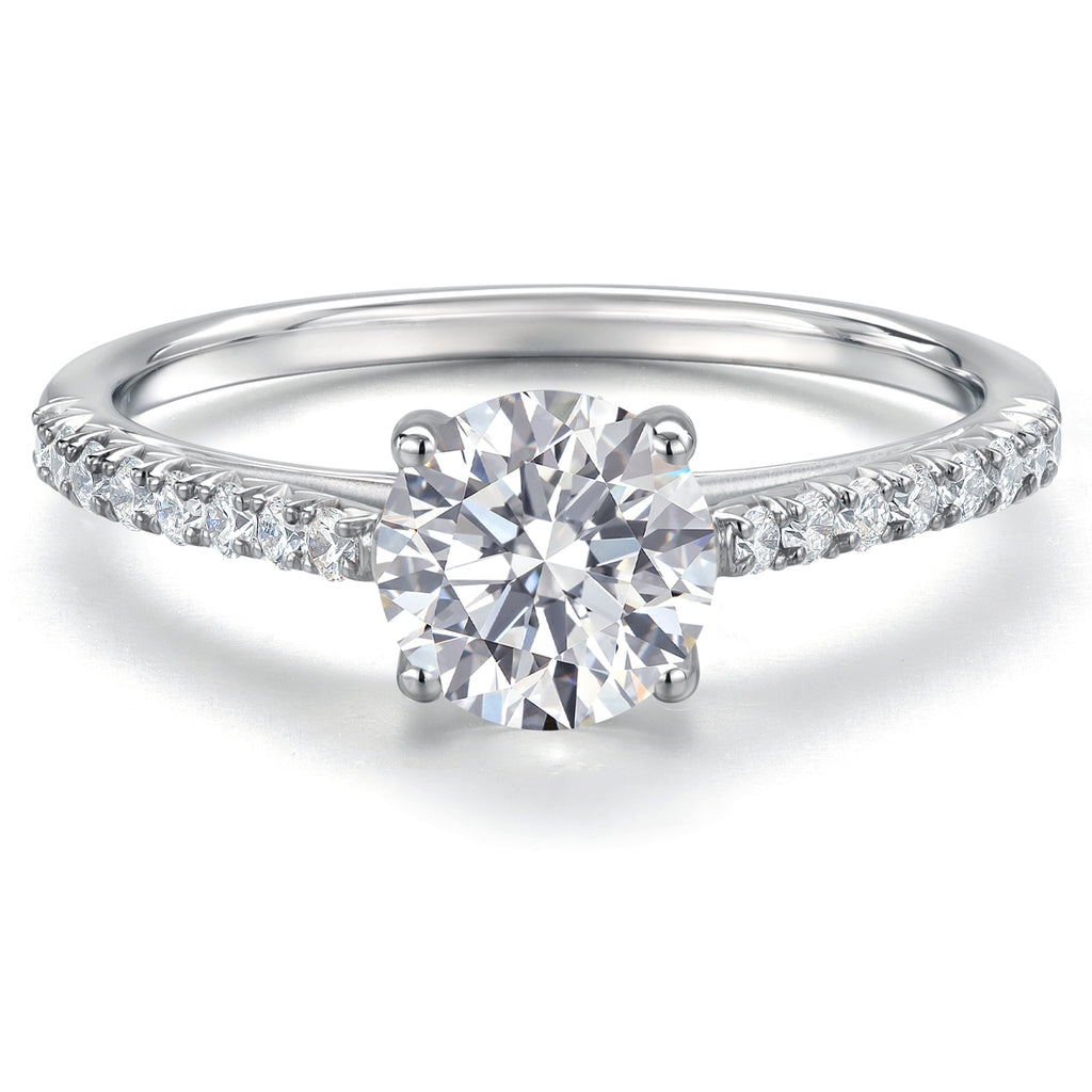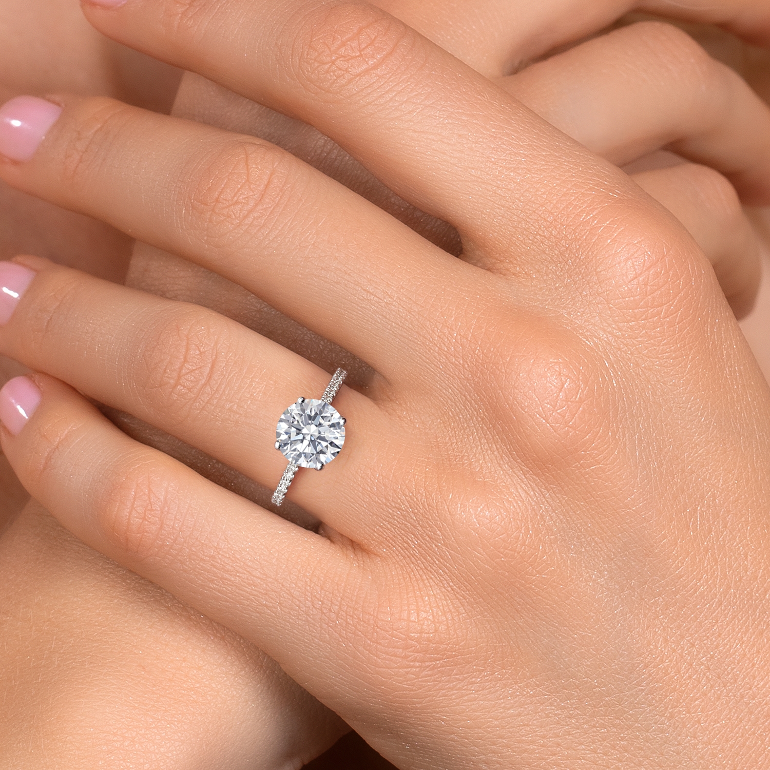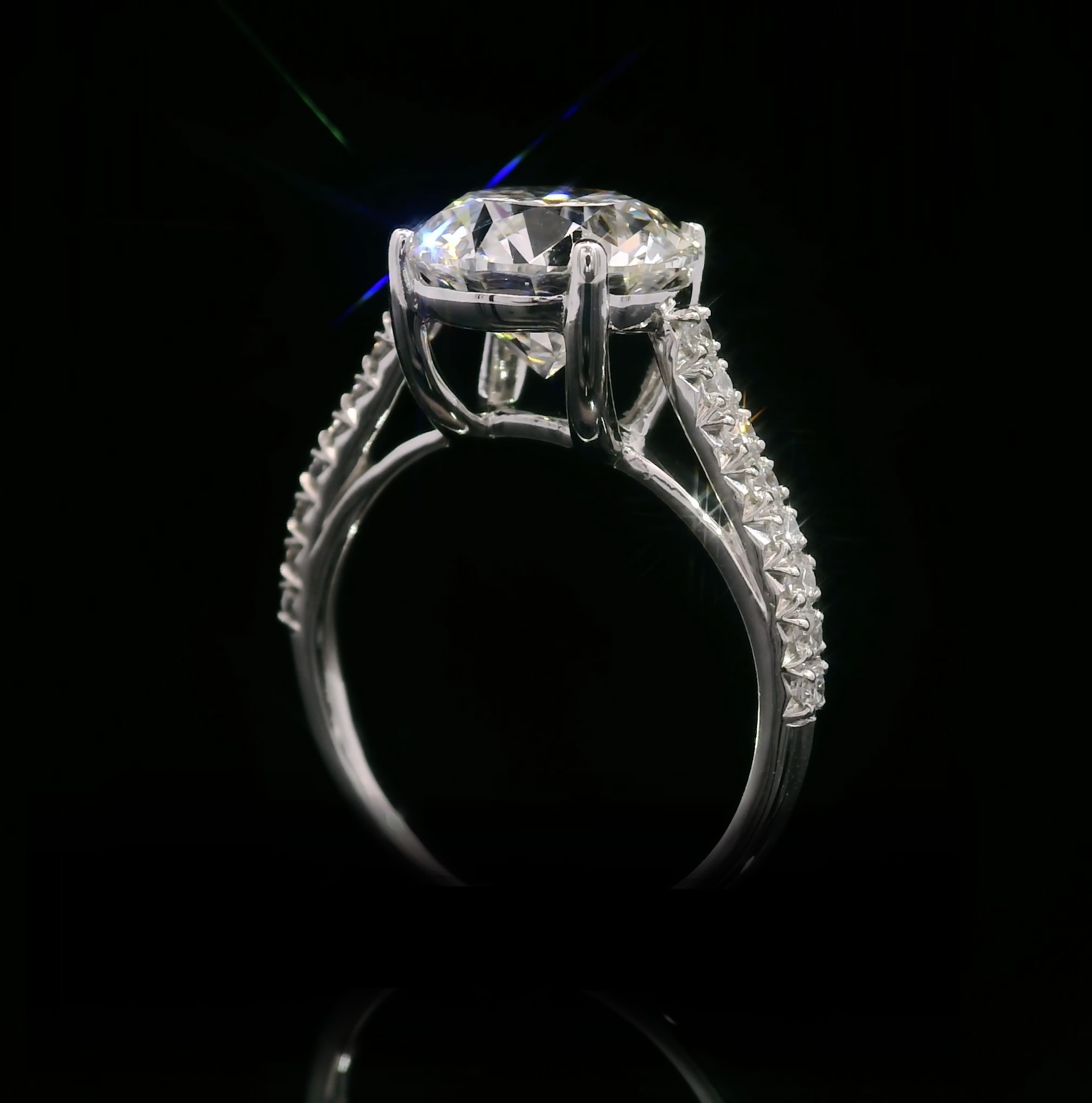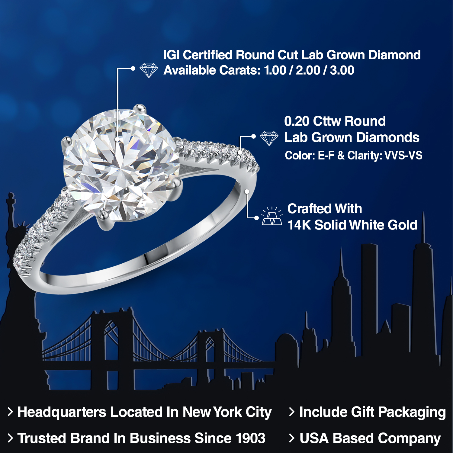 STUNNING 3.00 CT CENTER DIAMOND: This exquisite engagement ring features a breathtaking 3.00 Ct round lab-grown diamond as its centerpiece, and additional diamonds to total 3.20 Cttw. The round-cut diamond is known for its exceptional brilliance and fire, making this ring a dazzling symbol of your everlasting love and commitment.
