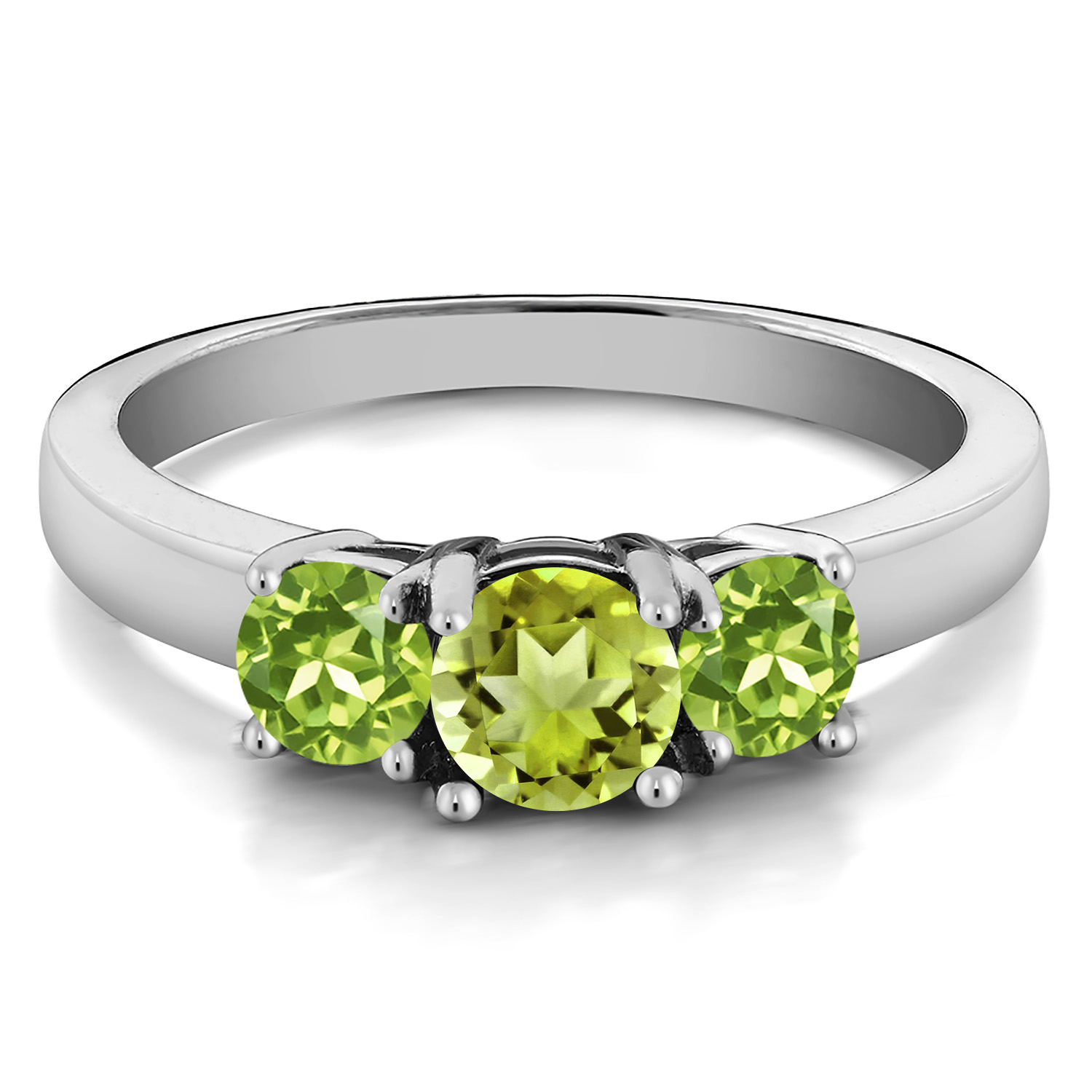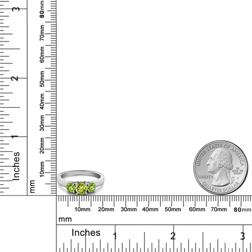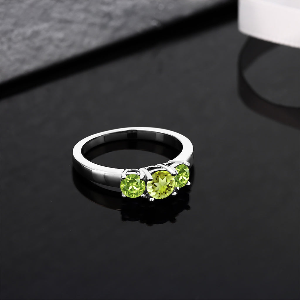 THREE-STONE PERIDOT BRILLIANCE: Features a 5mm round green peridot at the center accented by two 4mm round peridots, totaling 1.20 carats. The fresh green hue symbolizes renewal, balance, and harmony—perfect for meaningful occasions.