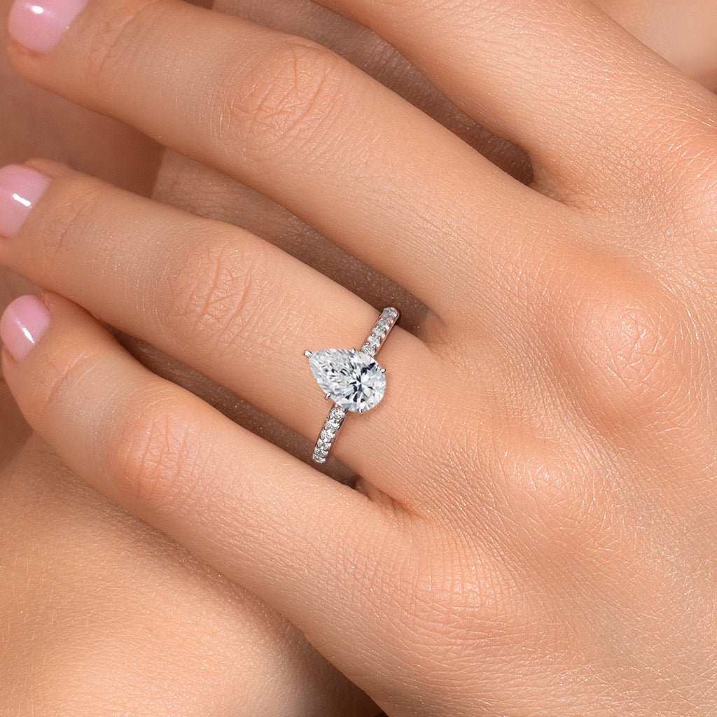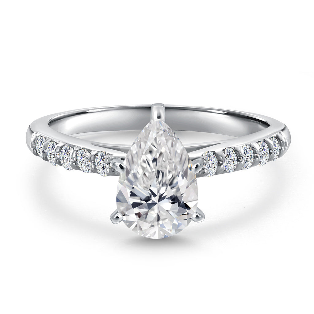 TIMELESS ELEGANCE: This 10K white gold engagement ring features a stunning 1.00 Ct IGI-certified pear-shaped lab grown diamond, totaling 1.20 Cttw, offering a classic and sophisticated design for the modern bride.