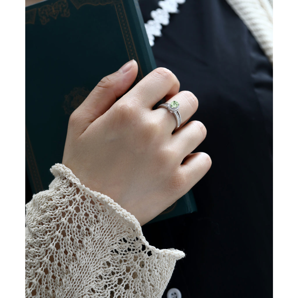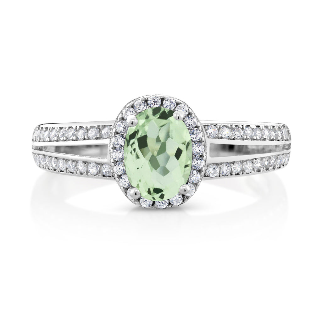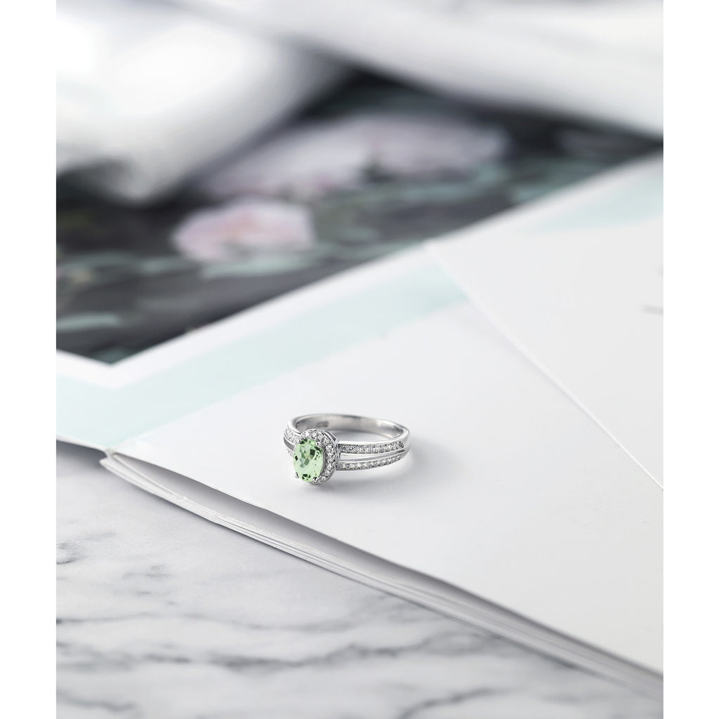 MEASUREMENTS: 7x5mm Oval Heat-Treated Green Prasiolite, 1x1mm Round White Zirconia. Total Carat Weight is 1.35 cttw