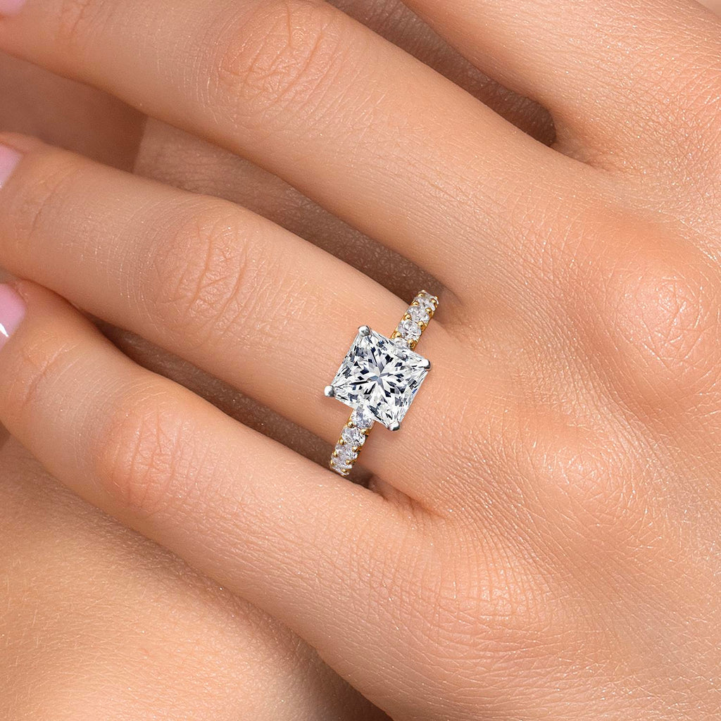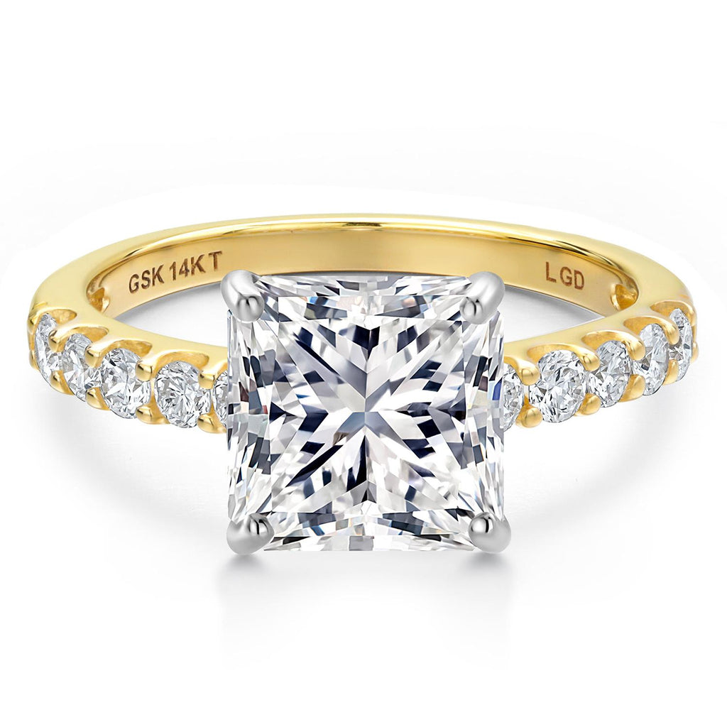 TWO-TONE GOLD DURABILITY: A strong yellow gold band anchors the design, while white gold prongs spotlight the princess center with vibrant contrast. This pairing enhances structural integrity, brilliance, and clean geometry for a sleek, tarnish-resistant finish that promises enduring beauty, making it perfect for everyday wear.