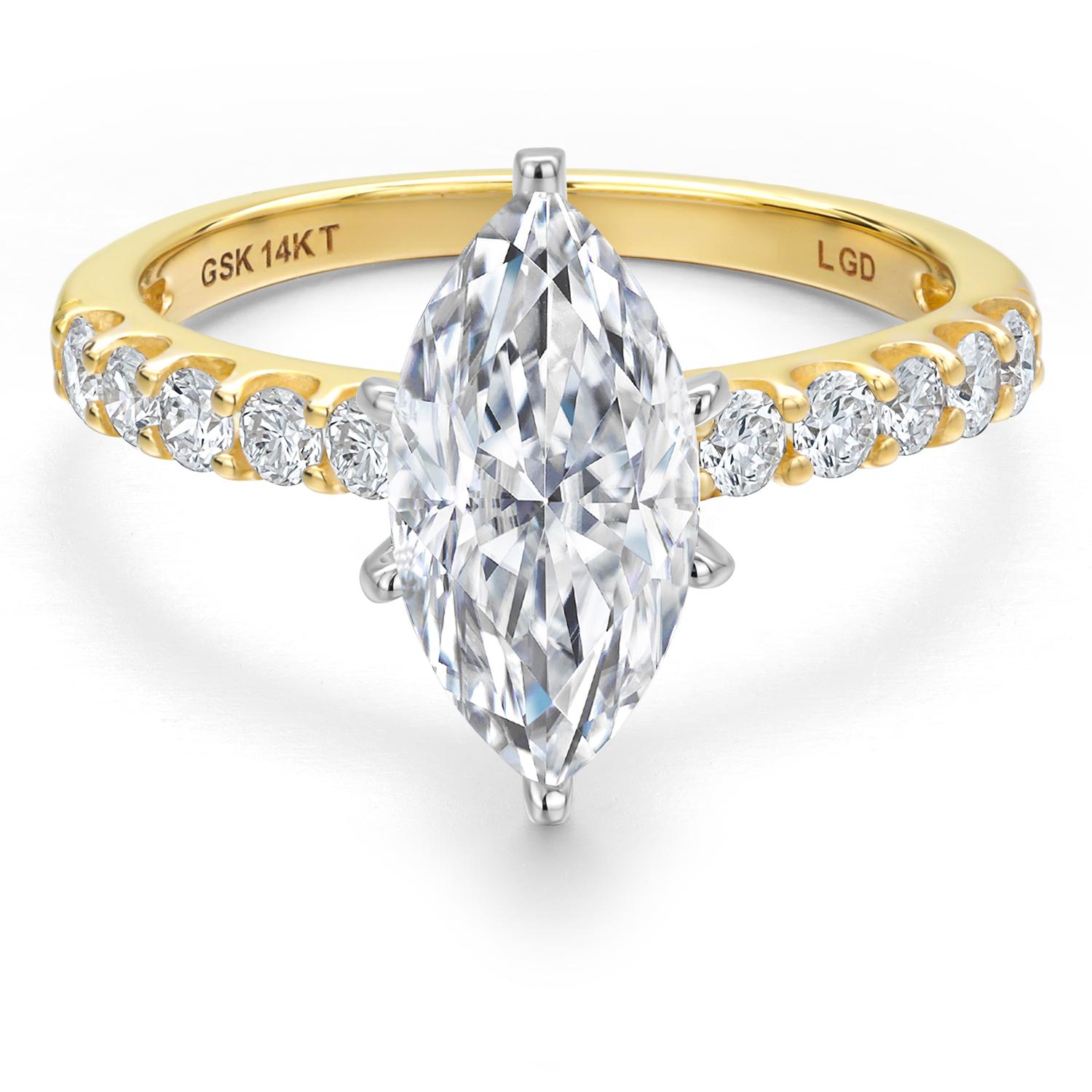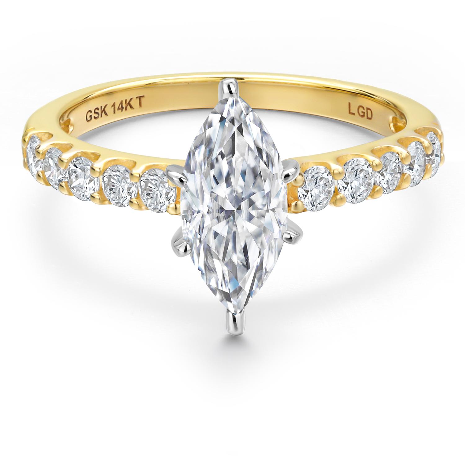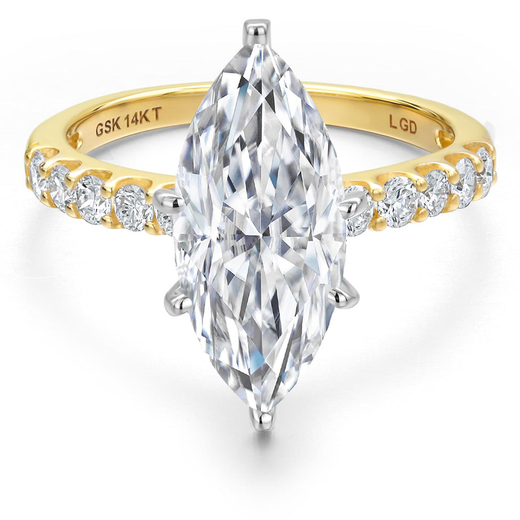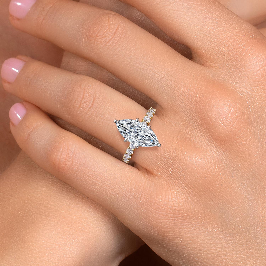 TWO-TONE GOLD EXCELLENCE: Yellow gold along the shank anchors the marquise shape with warmth, while white gold prongs enhance the center stone’s elongated brilliance. Durable and refined, this combination sharpens detail and brightens every facet.