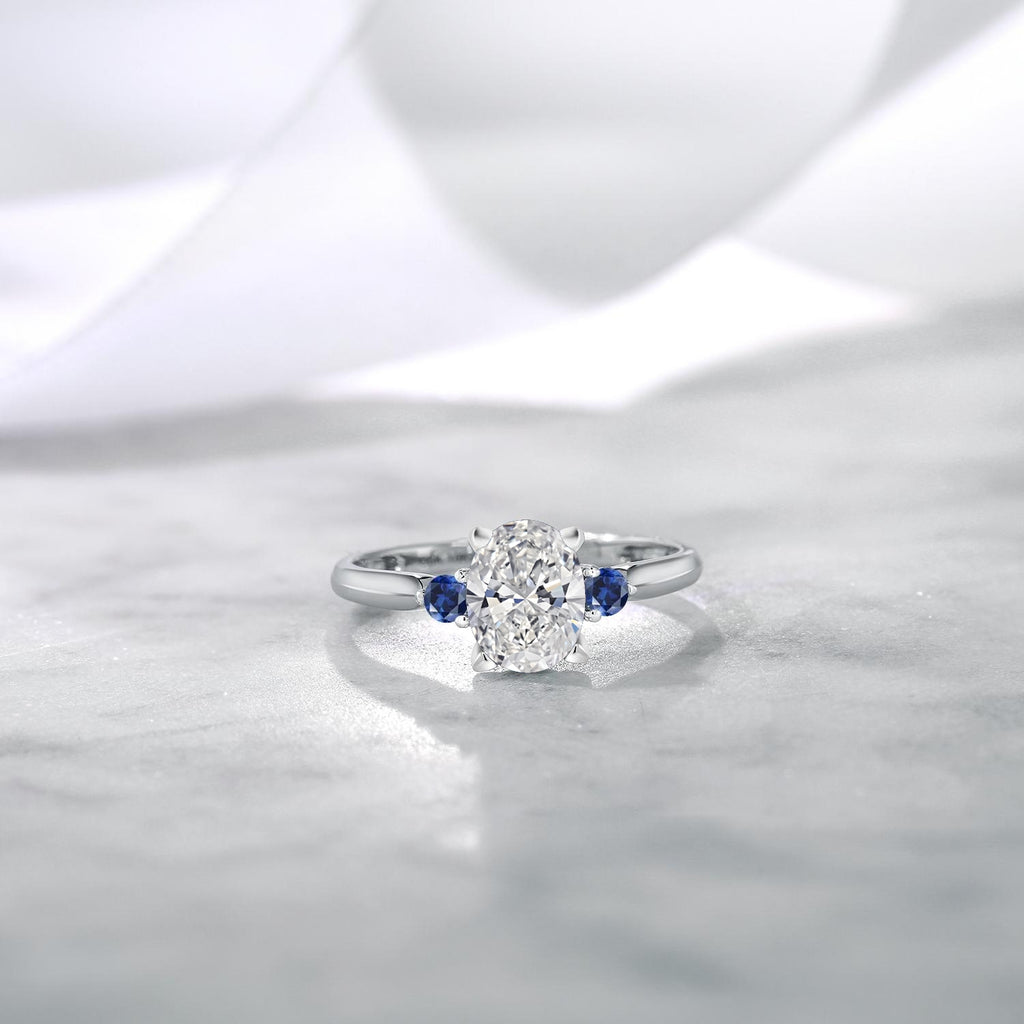 ELEGANT AND CAPTIVATING DESIGN: The center oval diamond, with its E-F Color and VS1-VS2 Clarity, sparkles with exceptional brilliance, while the striking created sapphires add a touch of vibrant color and sophistication. The combination of diamond and sapphire creates a captivating and elegant look, perfect for engagements, weddings, or anniversaries.