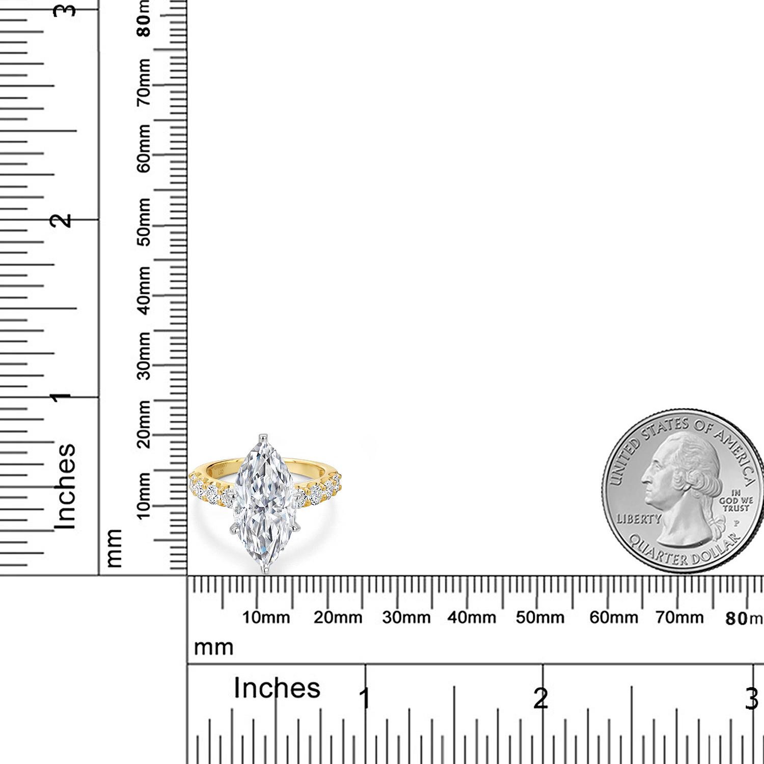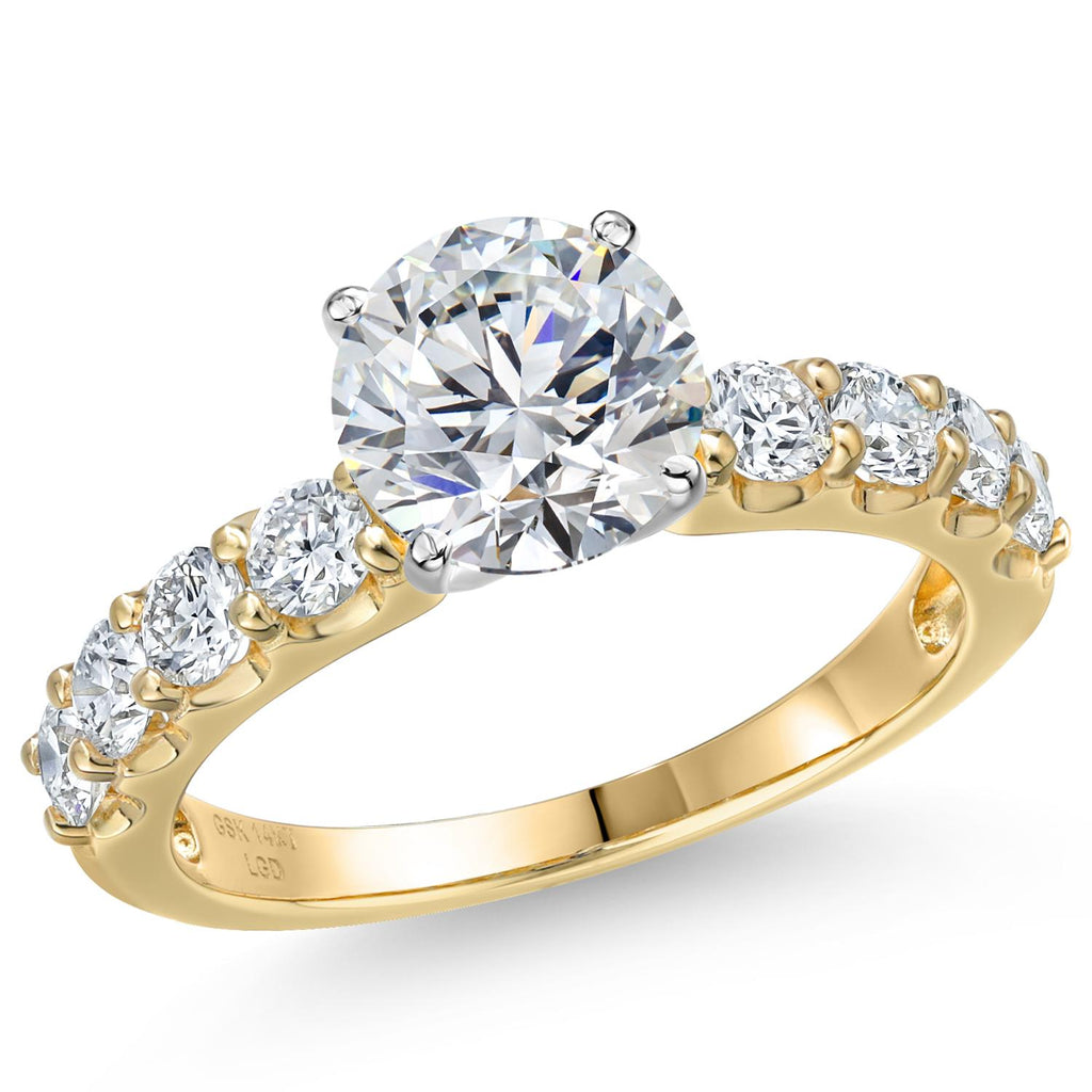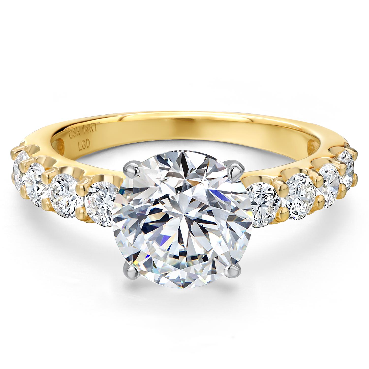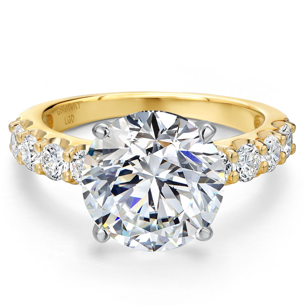 Item Info Total Carat Weight: 5.88 cttw Metal Type: Solid 14K Two Tone Gold Measurements: 11.00 x 11.00 mm Ring Size: 7 Setting Type: Prongs Main Gemstone Total Carat Weight: 5.00 cttw Carat Weight: 5.00 ct each Gem Type: Lab Grown Diamond Color: E - F Clarity: VS1 - VS2 Treatment Method: Not-treated Shape: Round Measurements: 11x11mm Number of Stone: 1 Accent Gemstones Total Carat Weight: 0.88 cttw Carat Weight: 0.11 ct each Gem Type: Lab Grown Diamond Color: E - F Clarity: VVS - VS Treatment Method: Not-treated Shape: Round Measurements: 3x3mm Number of Stone: 8