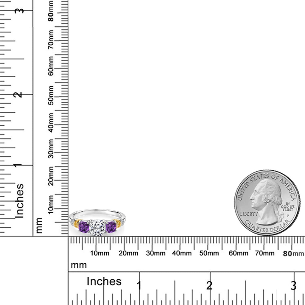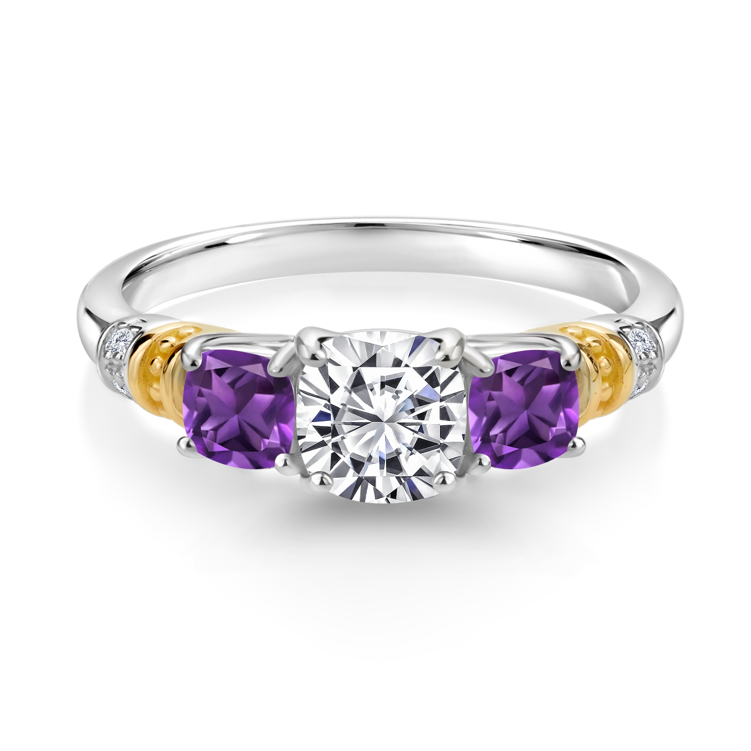 1.62 Cttw 925 Sterling Silver and 10K Yellow Gold IGI Certified Lab Grown Diamond and Amethyst 3 Stone Ring For Women | Center 1 Ct Cushion Diamond | E-F Color | VS1-VS2 Clarity