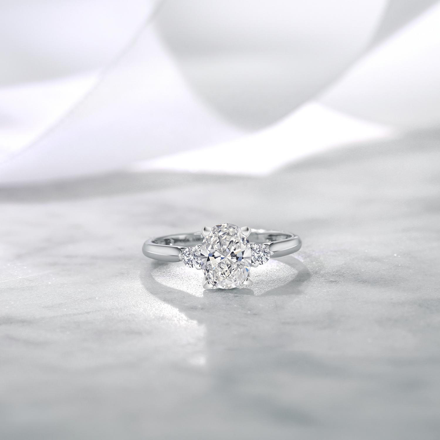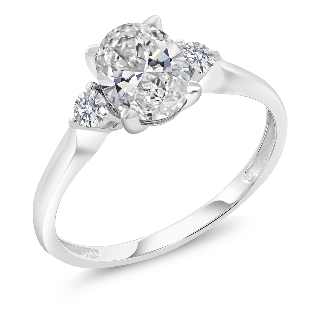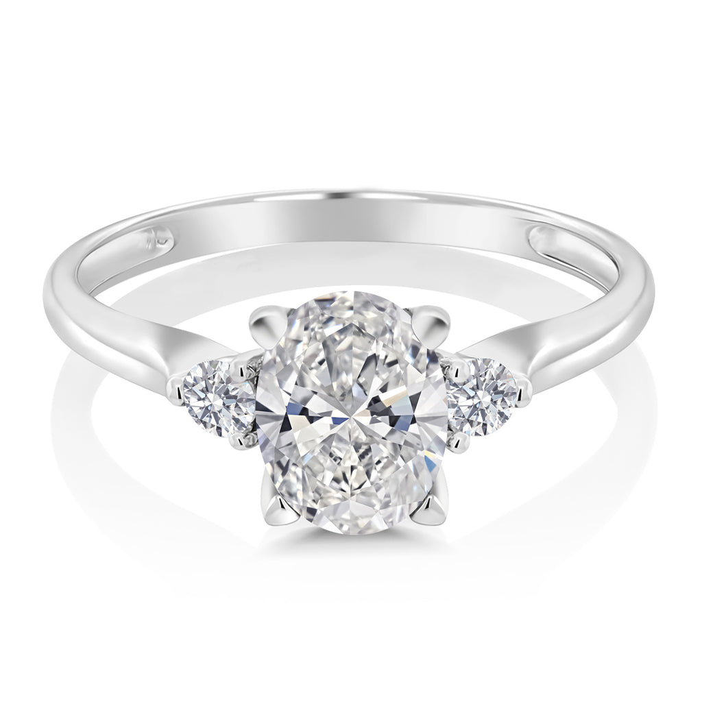 EXCEPTIONAL QUALITY AND CRAFTSMANSHIP: This stunning engagement ring features a total of 1.63 Cttw, showcasing a brilliant 1.5 Ct IGI certified lab grown oval diamond at its center, flanked by two sparkling 2.5MM side diamonds. Crafted from high-quality 10K white gold, this ring ensures durability and a luxurious finish, making it a timeless addition to any jewelry collection.