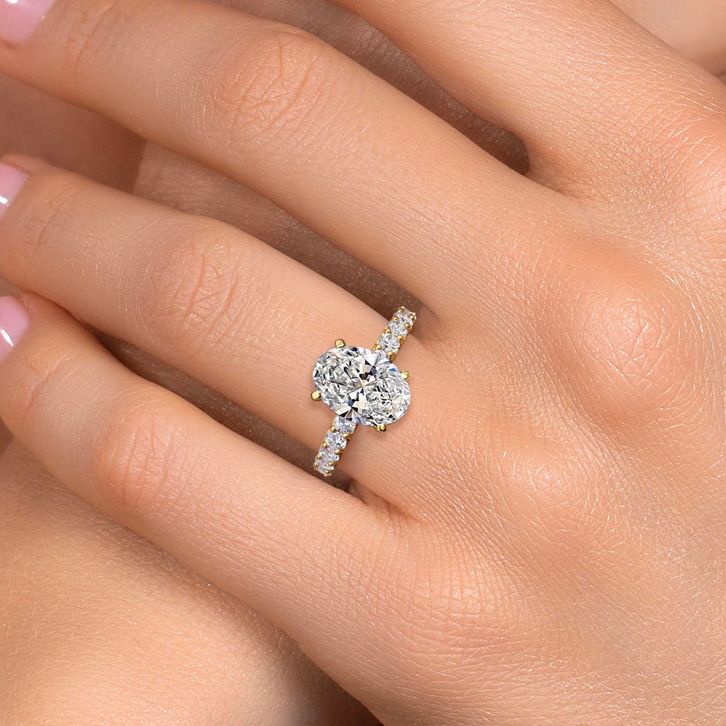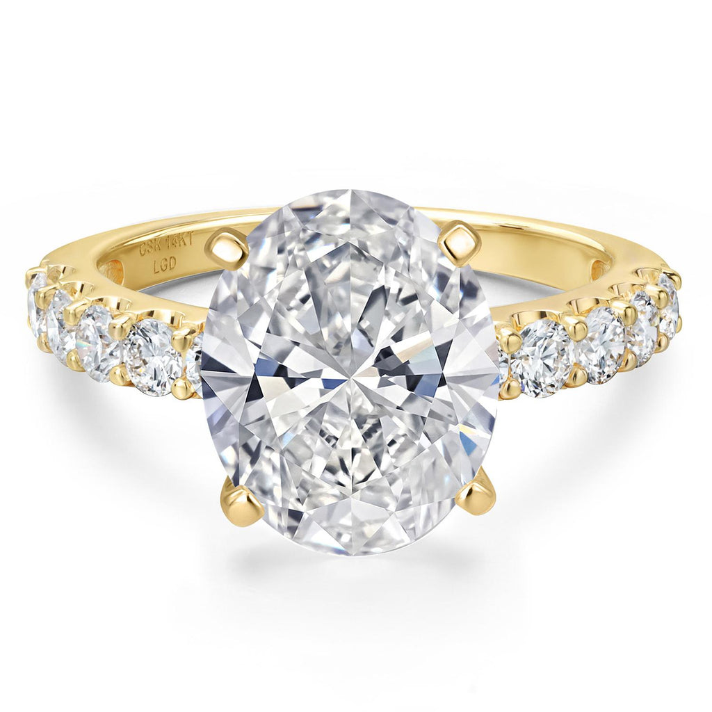 IGI-CERTIFIED CENTER DIAMOND: This engagement ring features a oval lab-grown diamond, IGI-certified for exceptional E–F color and VS1–VS2 clarity. Expertly cut to maximize brilliance and fire, it’s available in total carat weights ranging from 1.70 to 5.70 cttw for a radiant, personalized sparkle.