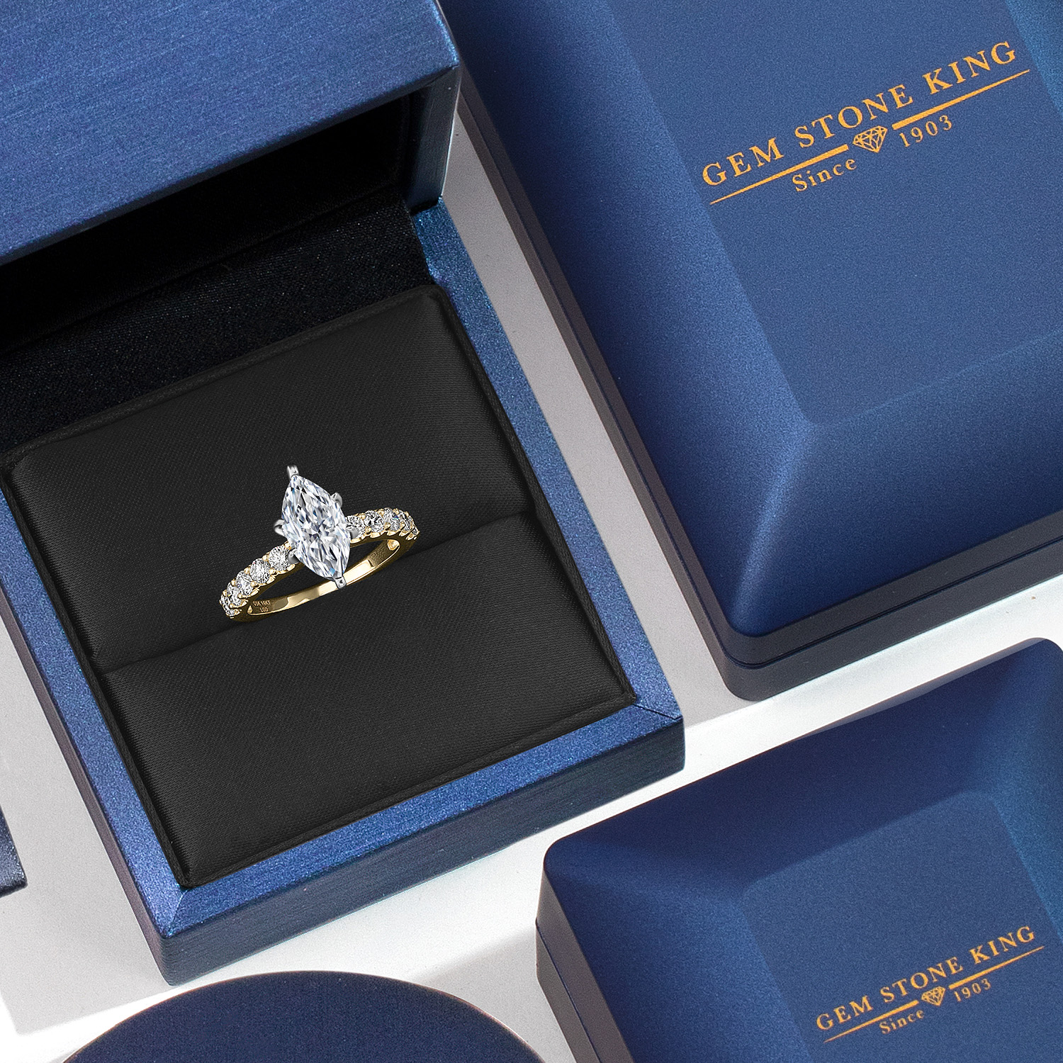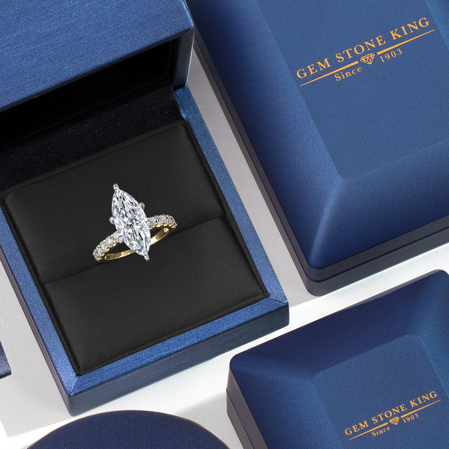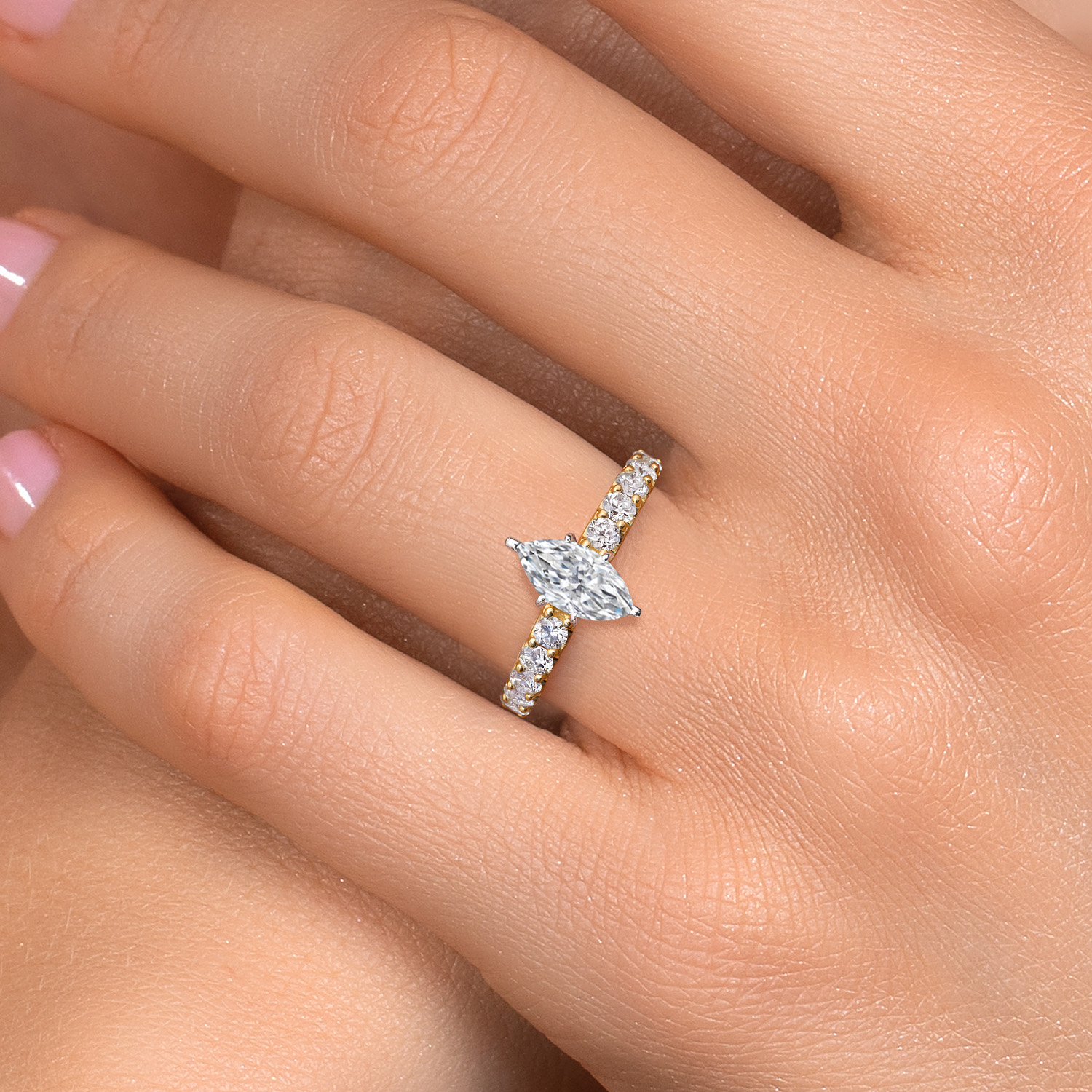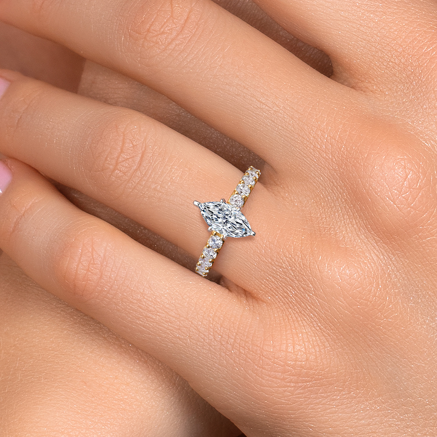 TOTAL 3.70 CTTW MARQUISE CUT DIAMOND RING: This design showcases a 3.00 carat IGI-certified marquise-cut lab-grown diamond in E–F color and VS1–VS2 clarity. Its elegant shape and sharp facets reflect exceptional light, with accent stones completing the total of 3.70 cttw.