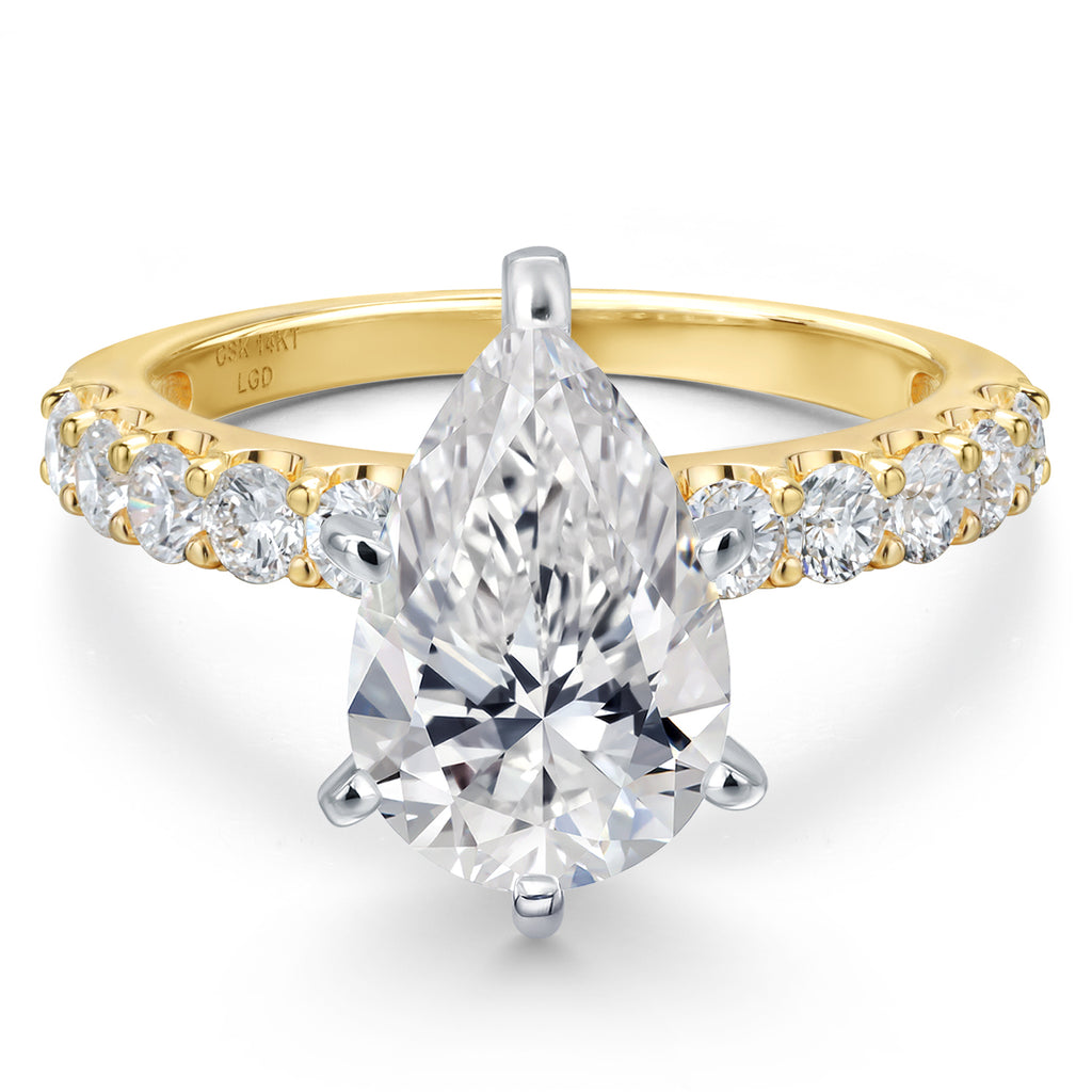 TOTAL 3.70 CTTW PEAR SHAPE DIAMOND RING: This design features a 3.00 carat IGI-certified pear-shaped lab-grown diamond in E–F color and VS1–VS2 clarity. Its luminous teardrop silhouette reflects timeless beauty, complemented by accent stones for a total of 3.70 cttw.