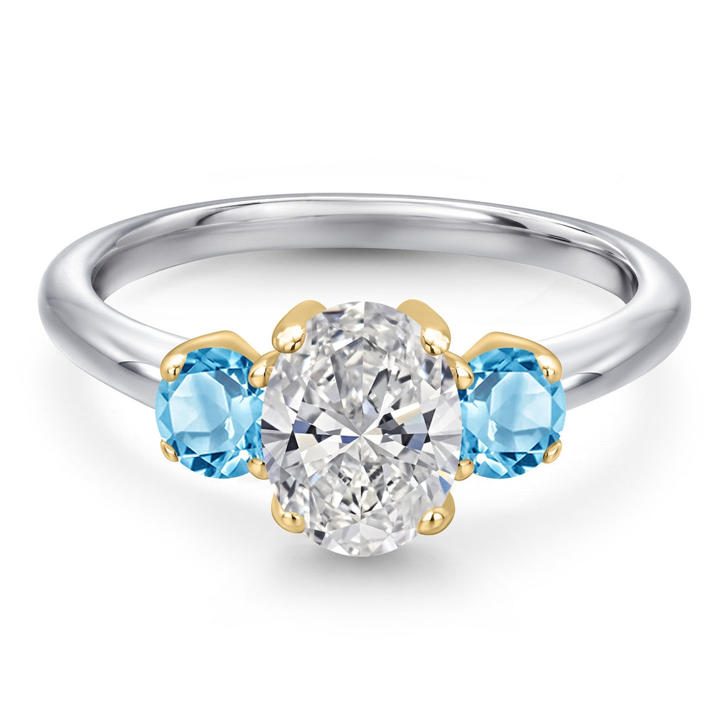 MEASUREMENTS: 8x6mm Oval E - F Lab Grown Diamond, 4x4mm Round Irradiated Swiss Blue Topaz. Total Carat Weight is 1.71 cttw