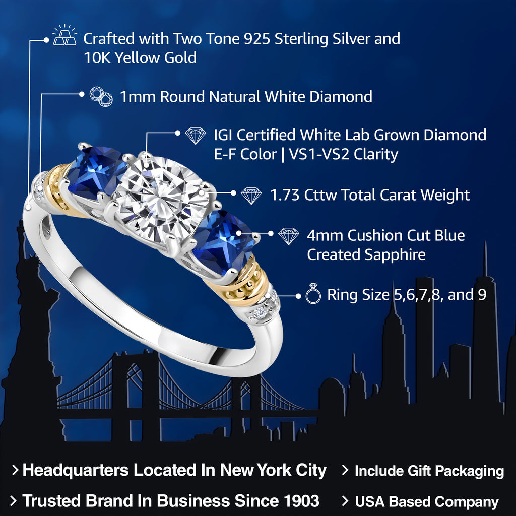 1.73 Cttw Lab Grown Diamond and Blue Created Sapphire Ring For Women | 925 Sterling Silver and 10K Yellow Gold | Center 1 Ct Cushion Diamond | IGI Certified | E-F | VS1-VS2