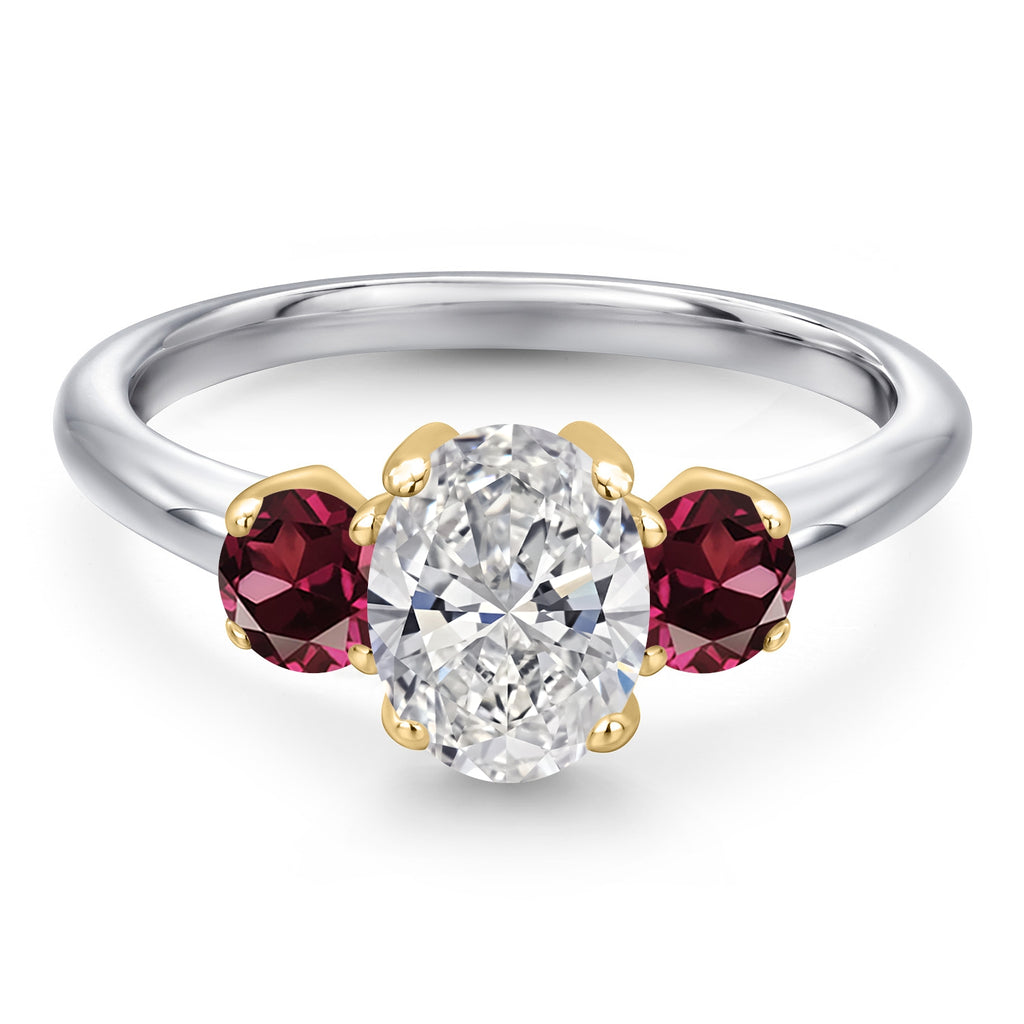 MEASUREMENTS: 8x6mm Oval E - F Lab Grown Diamond, 4x4mm Round Red Rhodolite Garnet. Total Carat Weight is 1.74 cttw