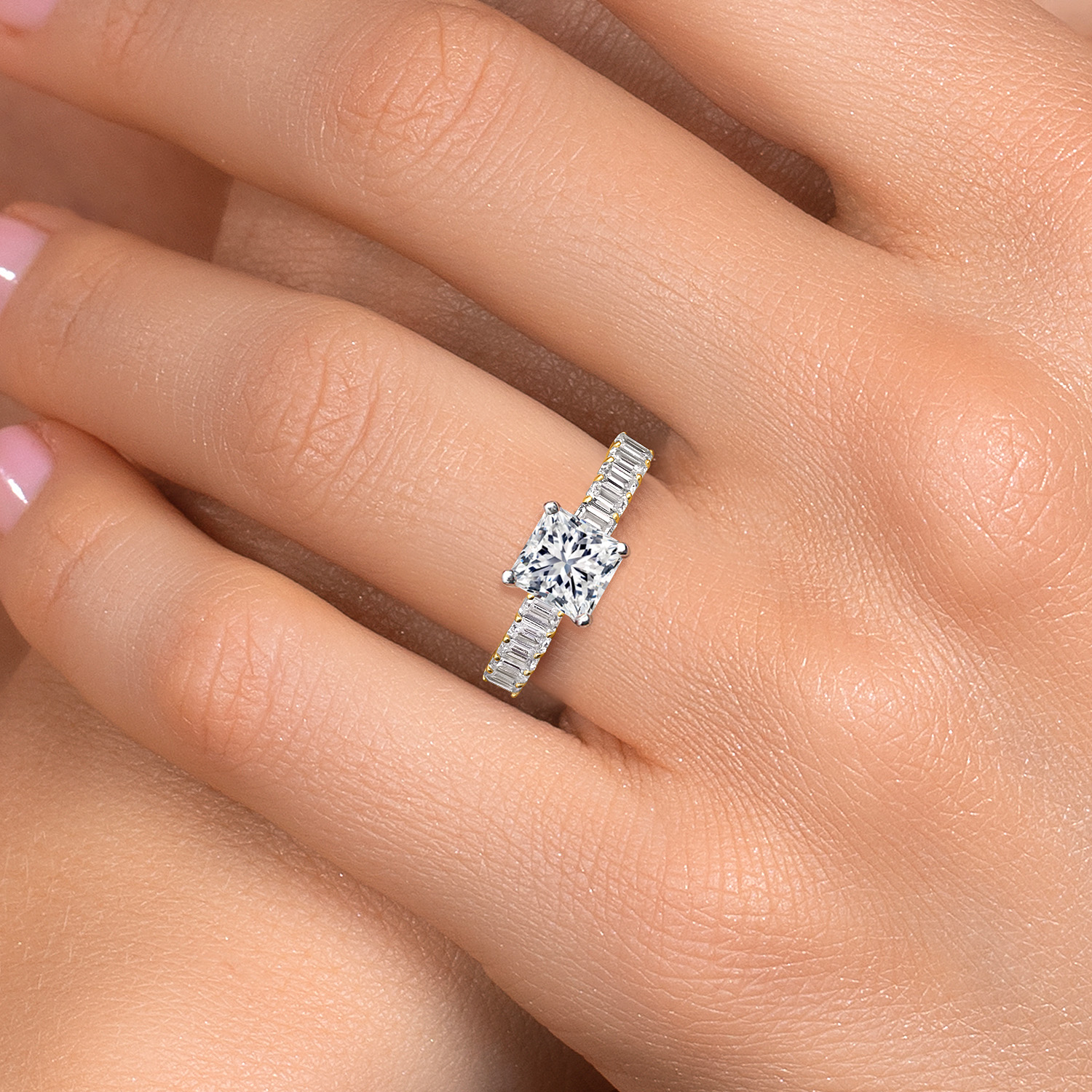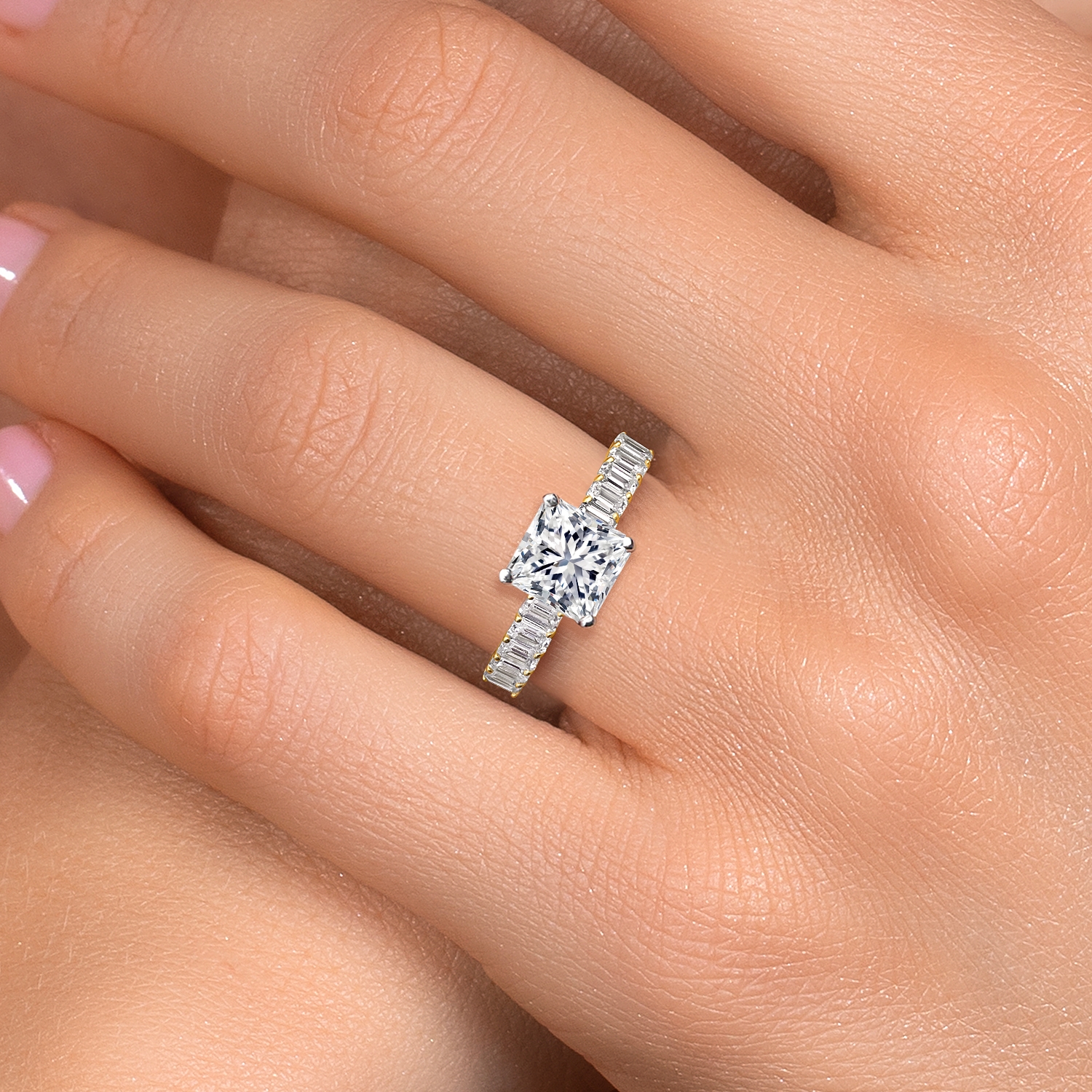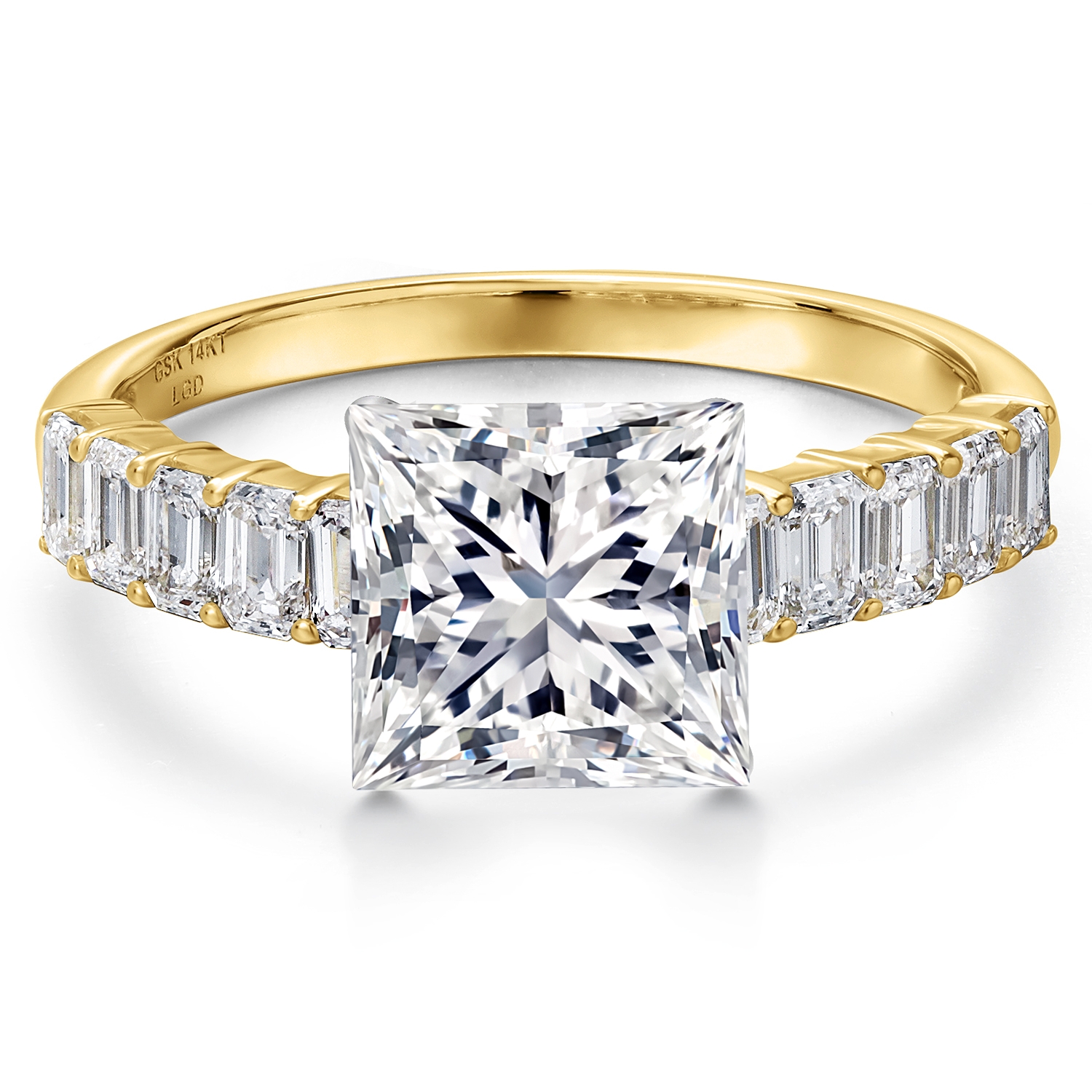 ACCENT DIAMOND RADIANCE: 3x2MM emerald-cut lab grown diamonds adorn the band, adding refined brilliance and depth. Their step-cut symmetry complements the bold center stone, creating an elegant blend of sparkle and geometry that highlights the ring’s timeless allure.
