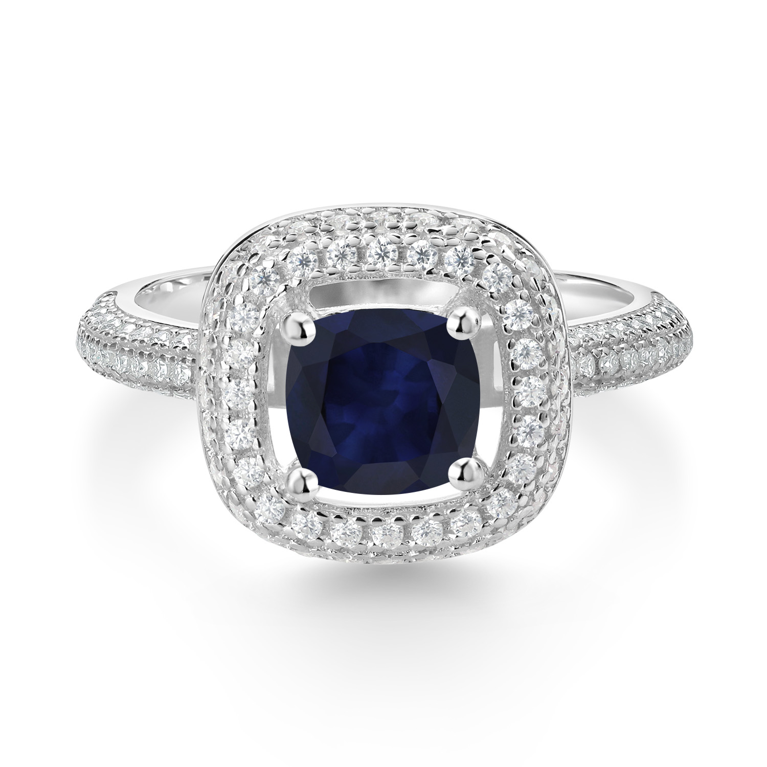 1.93 Cttw Blue Sapphire and White Moissanite Engagement Ring For Women | 925 Sterling Silver | Cushion 6MM | Gemstone Birthstone | Wedding Engagement Anniversary Ring For Women
