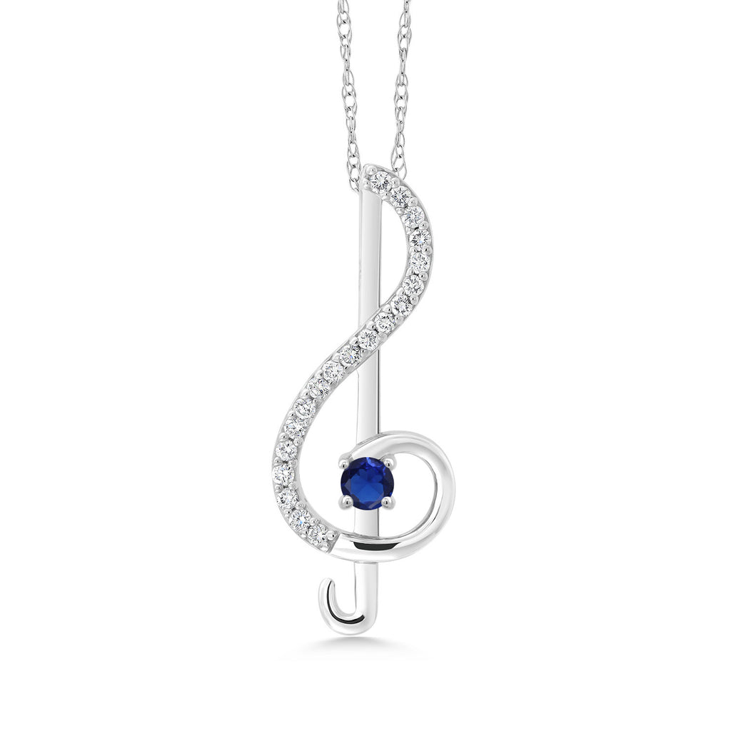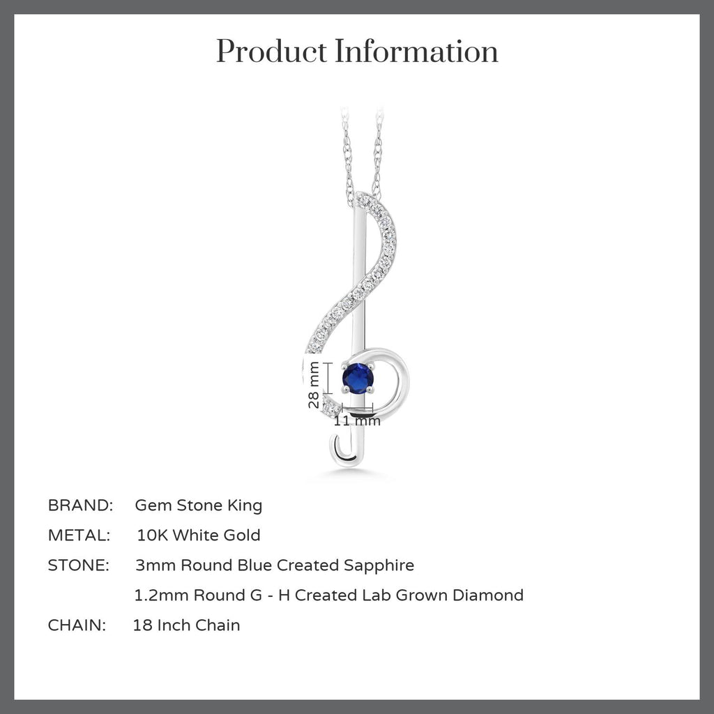 10K White Gold Blue Created Sapphire and Lab Grown Diamond Treble Clef Pendant Necklace Music Note Jewelry Gift For Women By Keren Hanan (0.67 Cttw, with 18 Inch Chain)