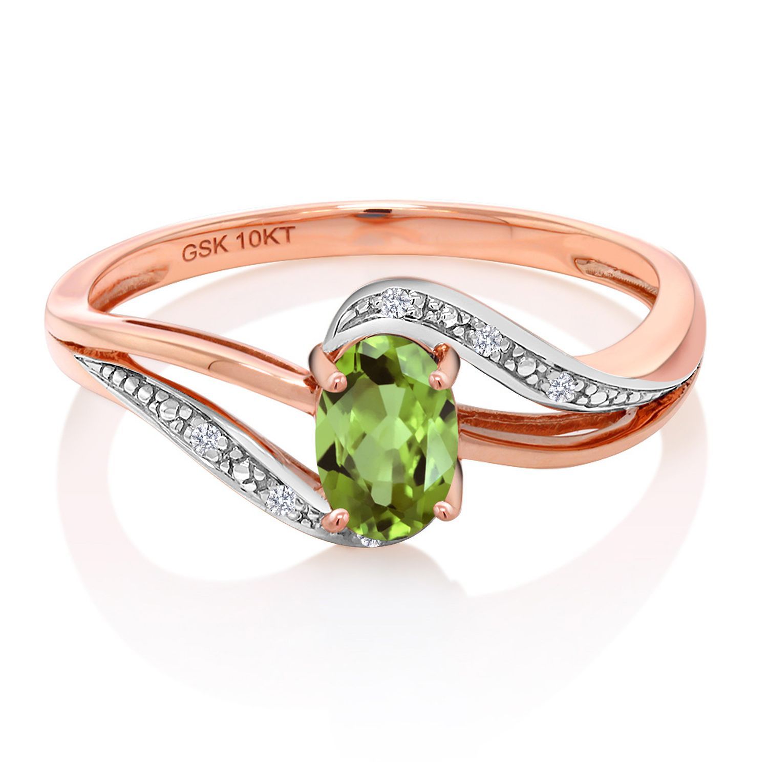 EXCEPTIONAL QUALITY AND CRAFTSMANSHIP: This exquisite bypass ring features a vibrant 6X4MM green peridot gemstone, beautifully accented by sparkling diamonds with a total carat weight of 0.54 Cttw. Crafted from high-quality 10K rose gold, this ring ensures durability and a luxurious finish, making it a timeless addition to any jewelry collection.