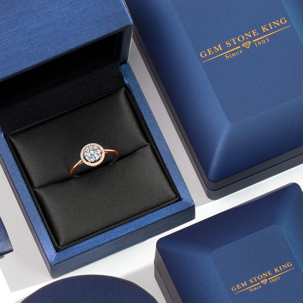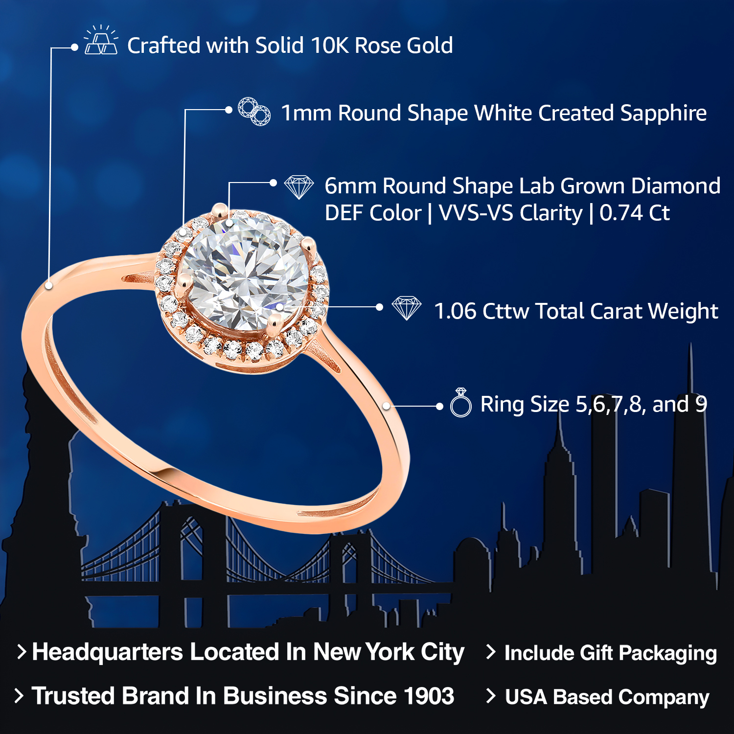 MEASUREMENTS: 6x6mm Round E - F Lab Grown Diamond, 1x1mm Round White Diamond. Total Carat Weight is 1.06 cttw