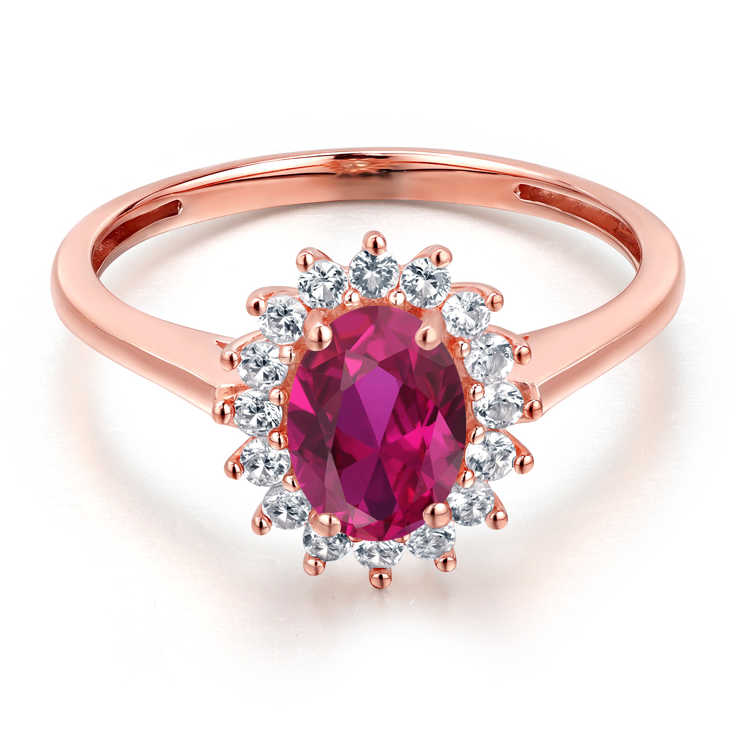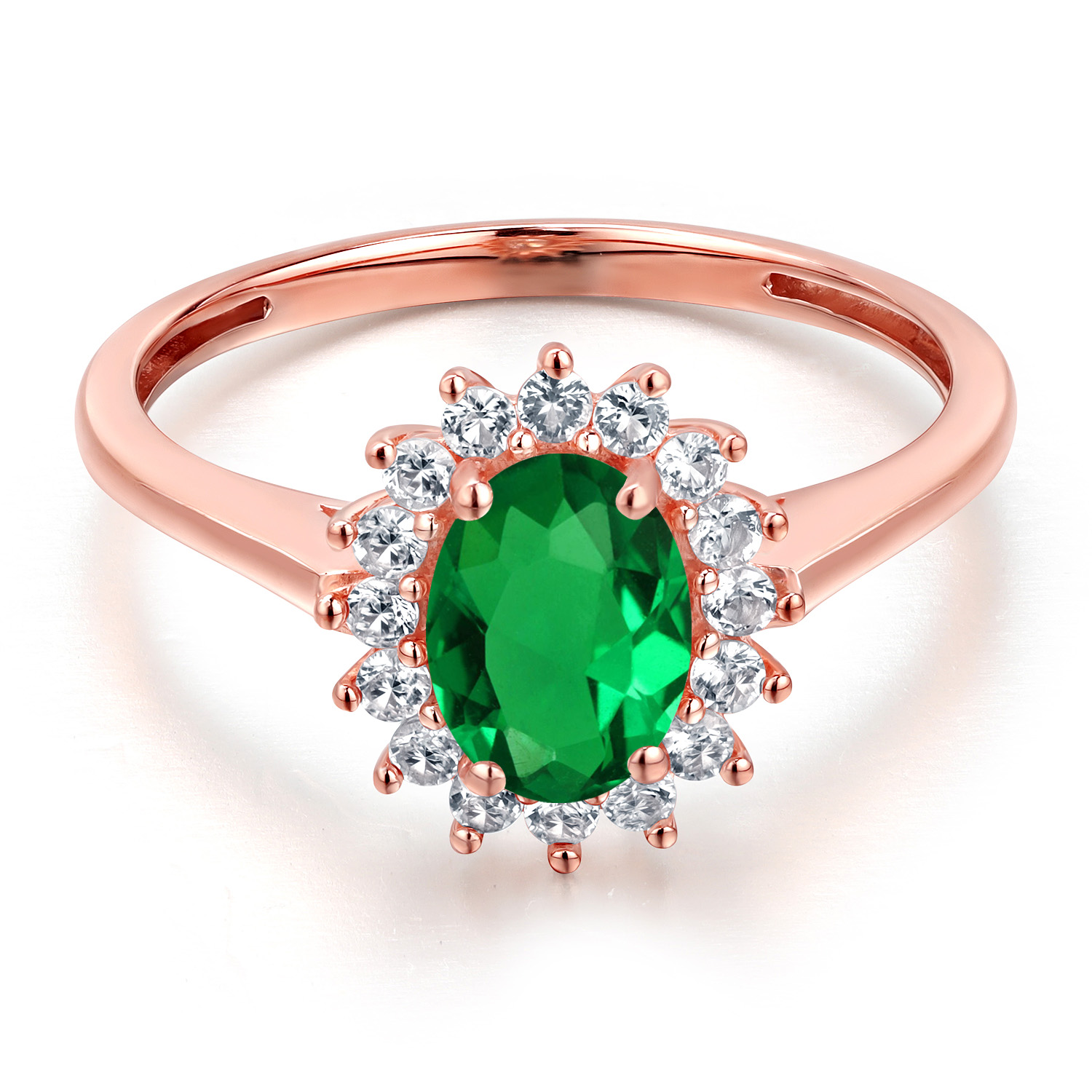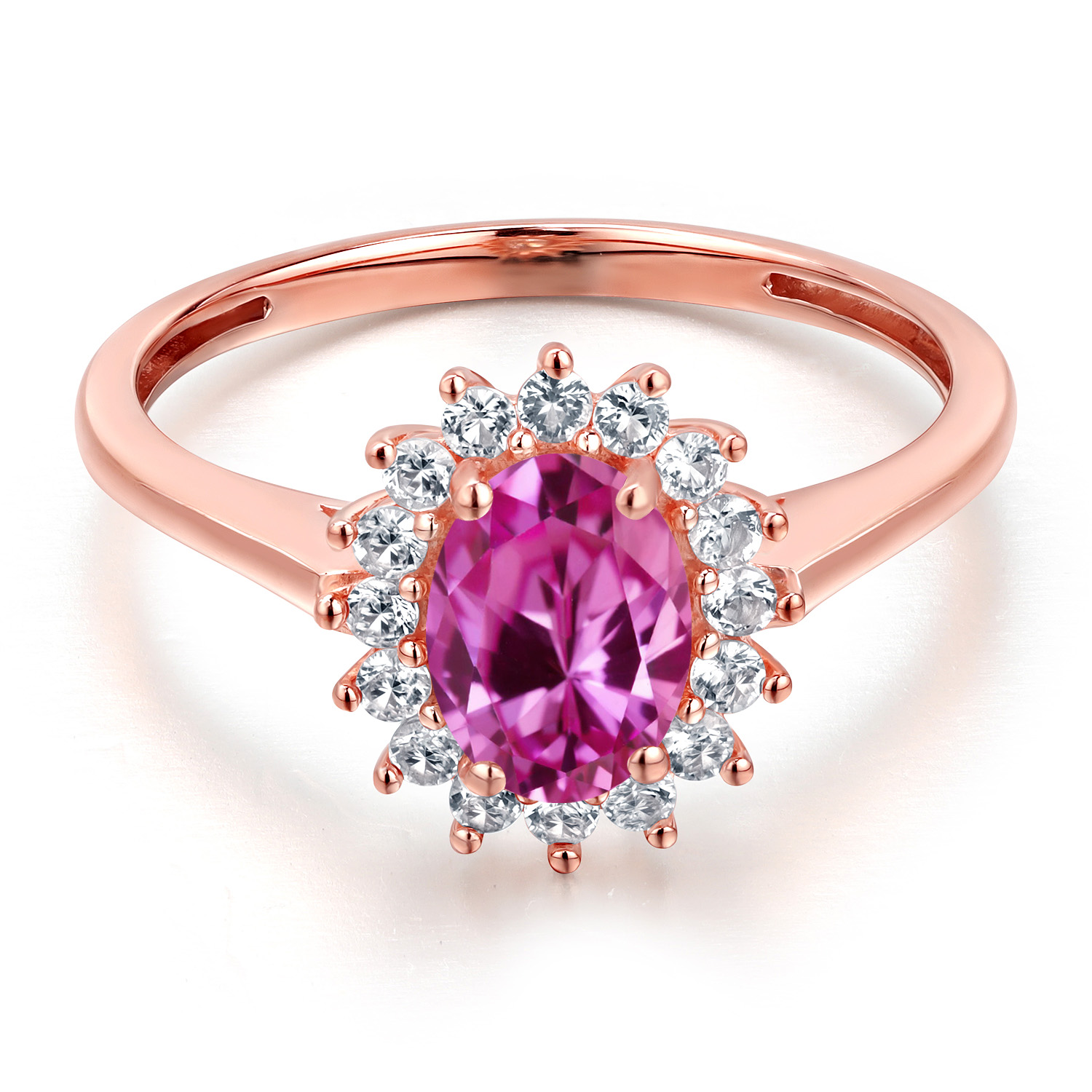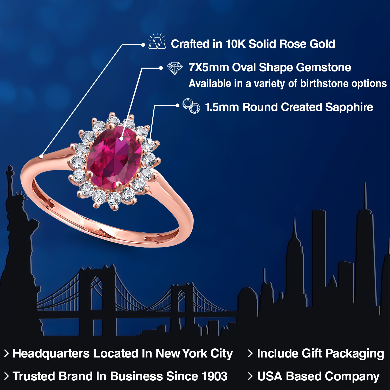 SPARKLING WHITE CREATED SAPPHIRE HIGHLIGHTS: Gracefully flanking the main gemstone are shimmering white created sapphires, each stone carefully selected and set with precision for maximum fire and sparkle. These dazzling accents add a touch of glamour to the ring’s overall design, creating a breathtaking halo effect that enriches the stone’s elegance. Handcrafted by skilled artisans, the ring exemplifies meticulous craftsmanship and attention to detail.