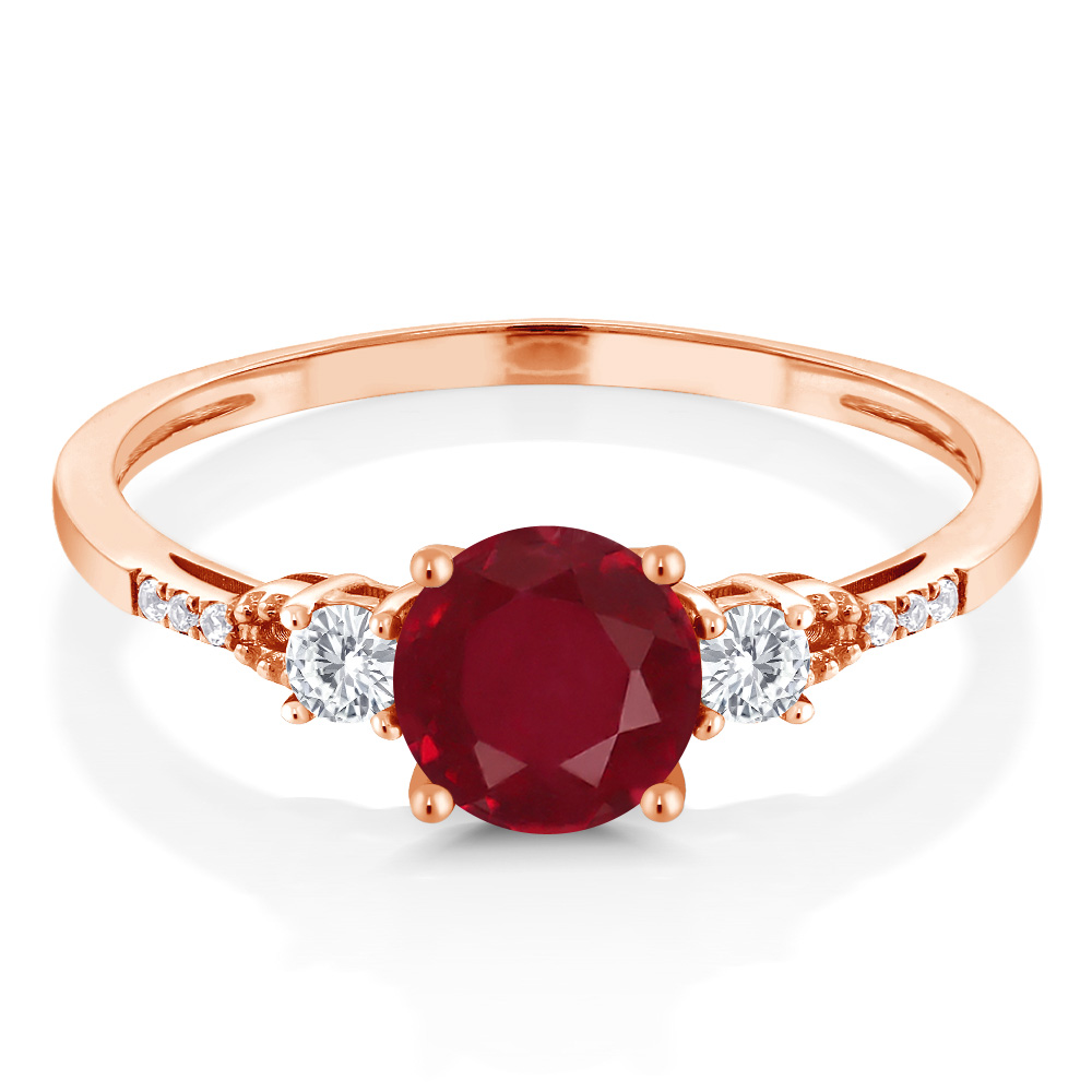 10K Rose Gold Red Ruby White Created Sapphire and White Diamond Accent 3-Stone Engagement Ring For Women (1.14 Cttw, Round 6MM, Gemstone July Birthstone)