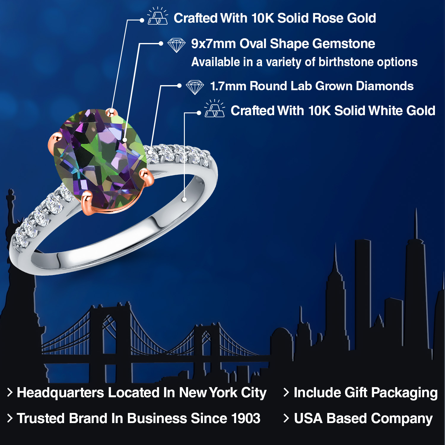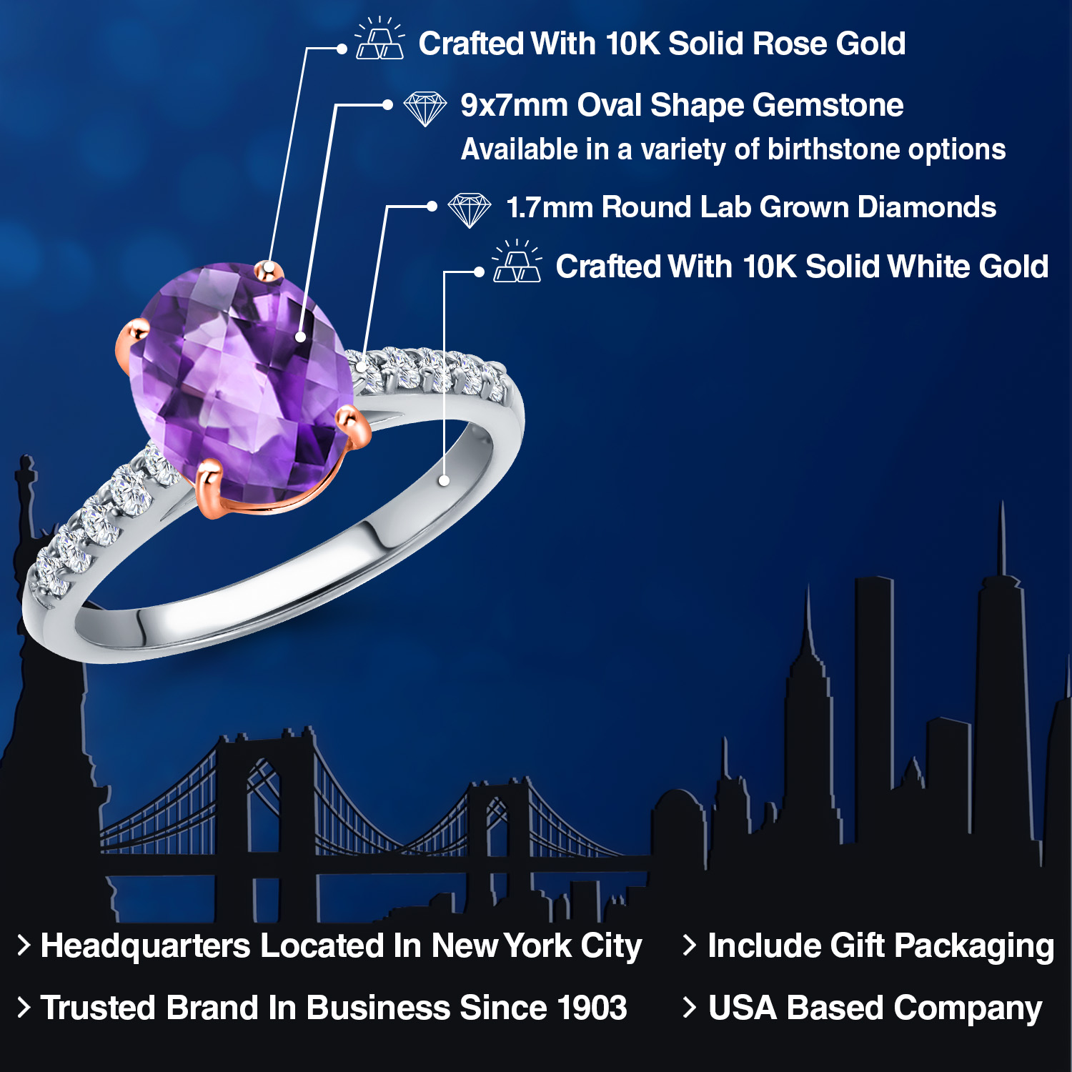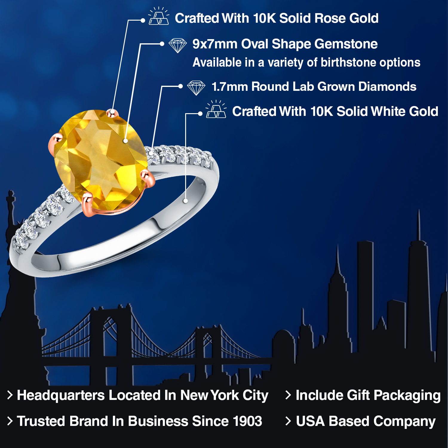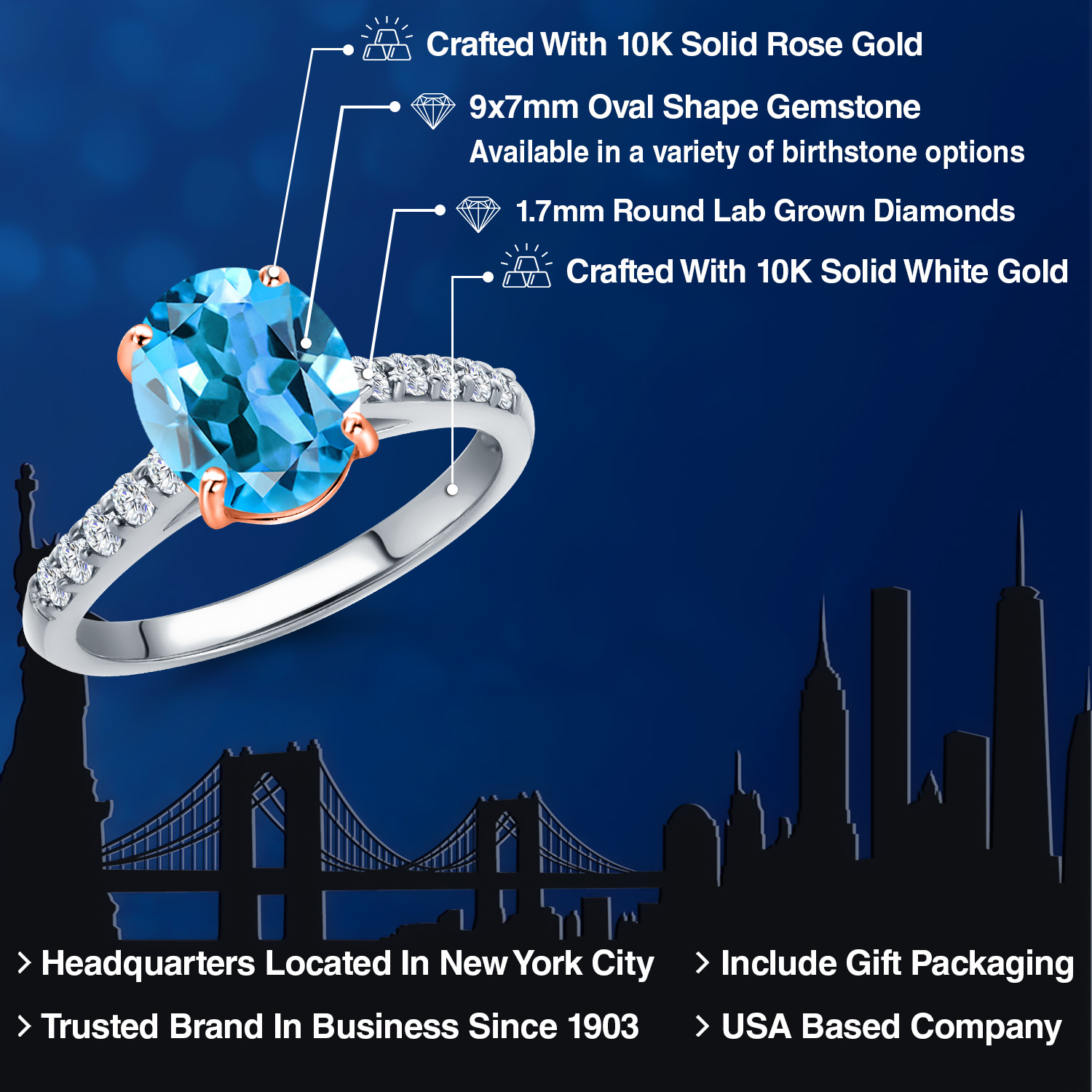 10K Two Tone Gold Gemstone Birthstone and White Lab Grown Diamond Accent Engagement Ring For Women | Oval 9X7MM and Round 1.7MM | Wedding Anniversary Promise Ring | Sizes 5, 6, 7, 8, 9