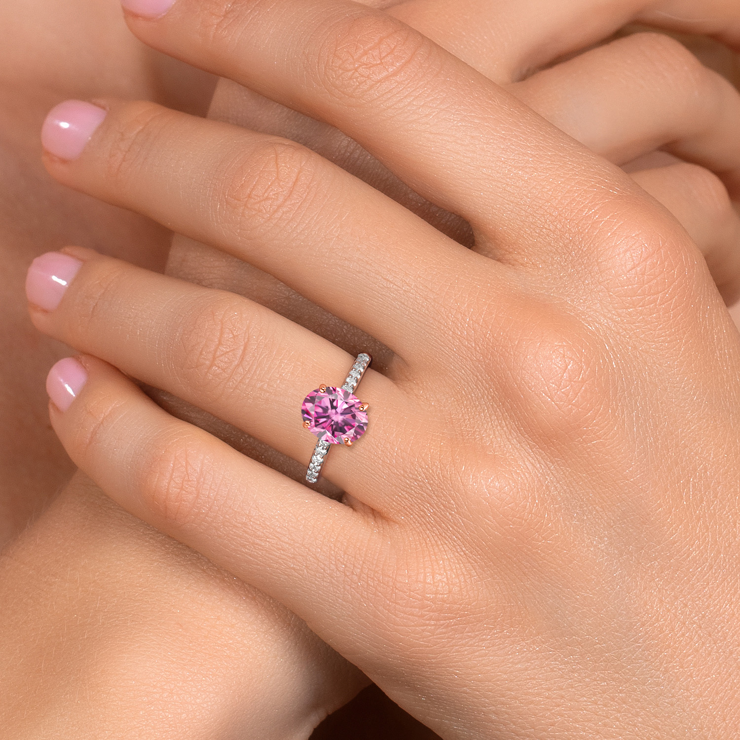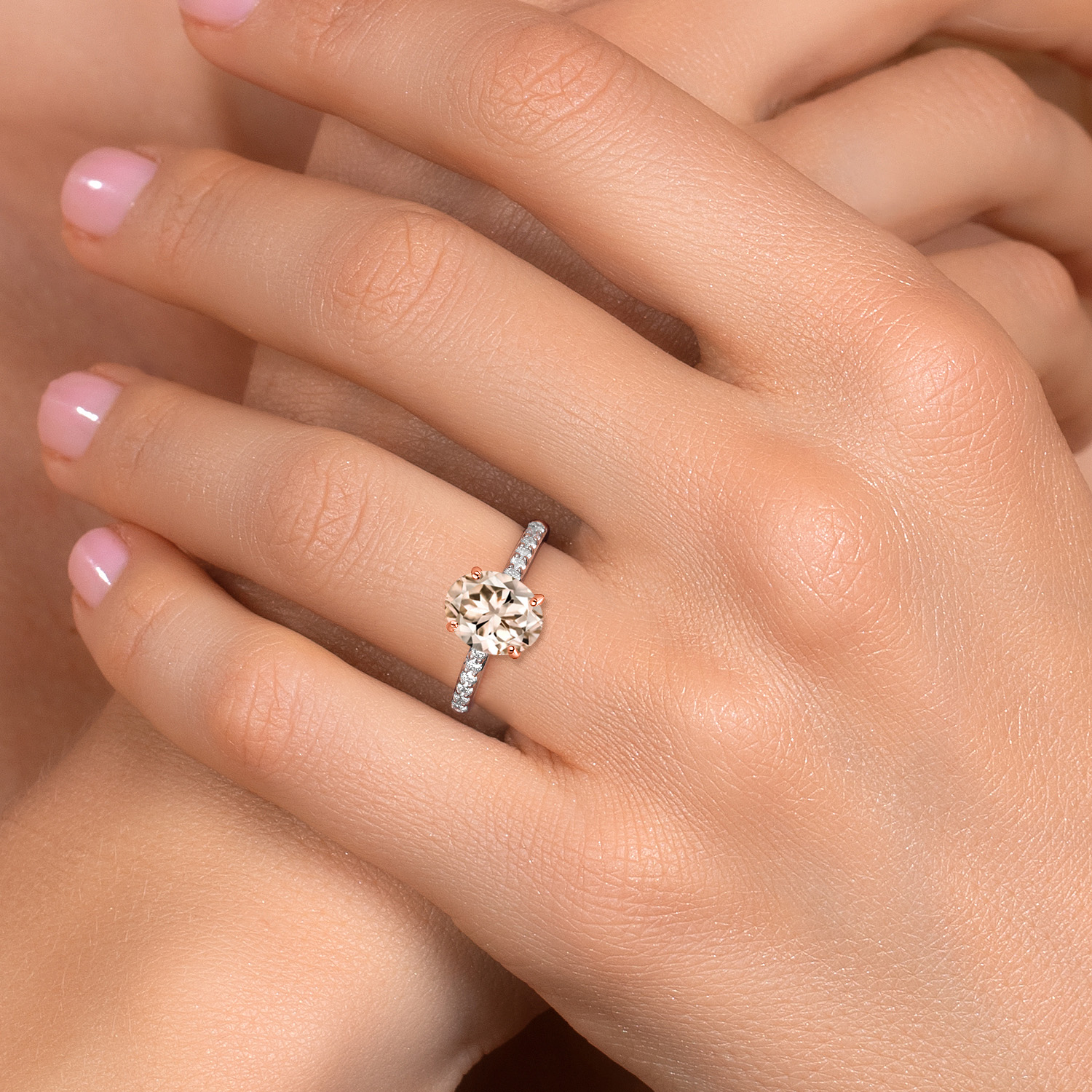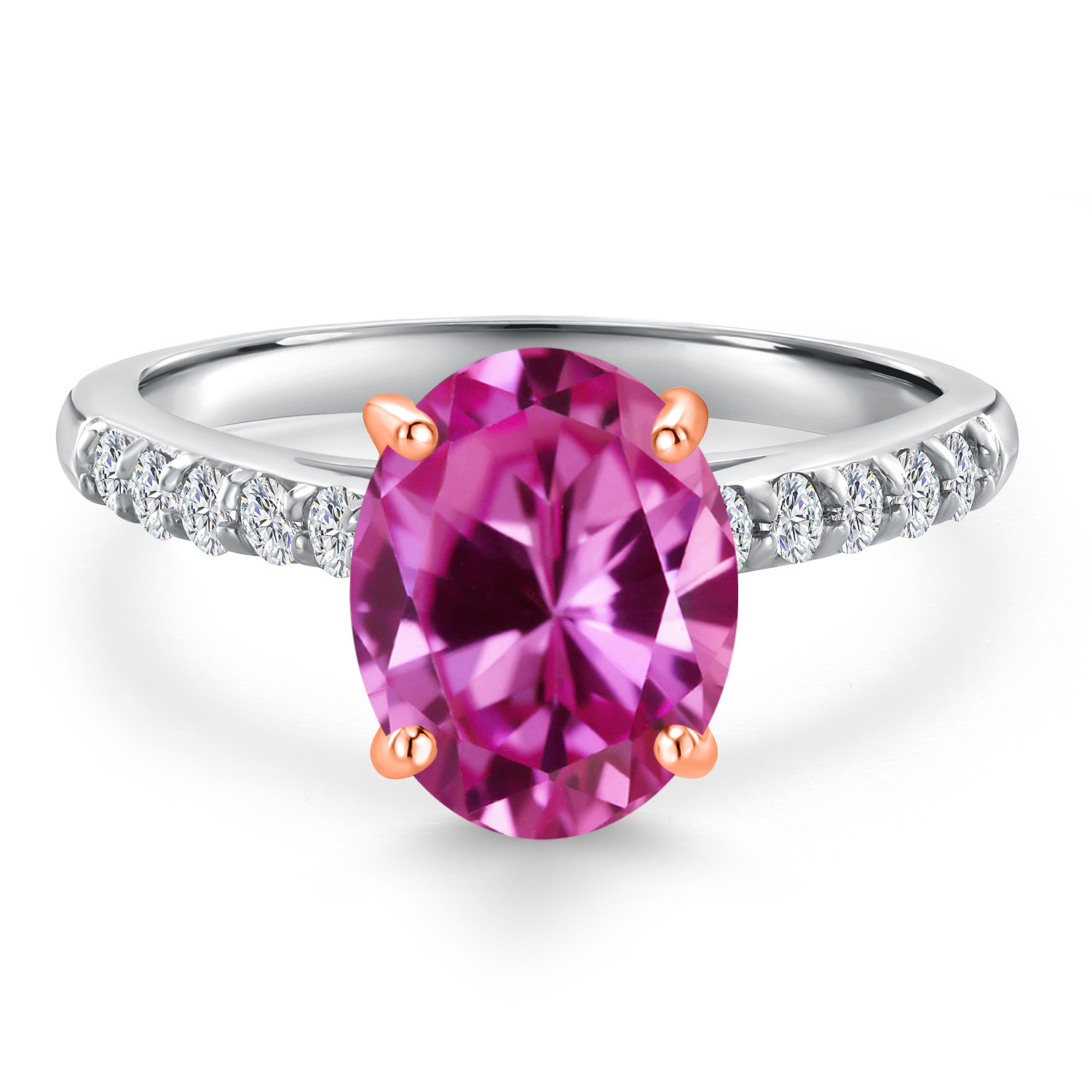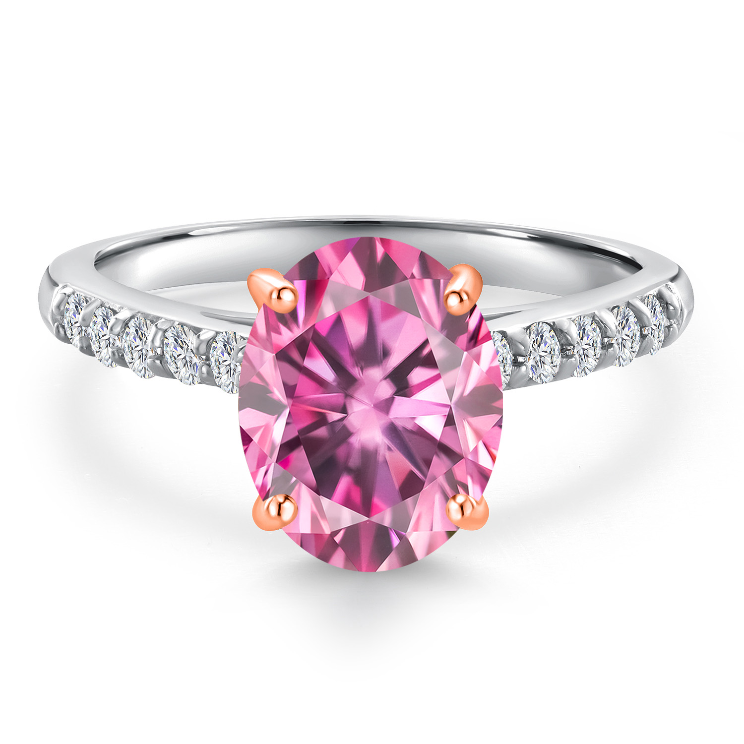 ROSE GOLD PRONG CRAFTSMANSHIP: The delicate rose gold prongs securely cradle the main gemstone, complemented by round 1.7MM white lab-grown diamond accents that add an extra layer of sparkle. These ethically sourced diamonds are expertly set to enhance the ring's overall brilliance, showcasing superior craftsmanship and attention to detail. This engagement ring embodies elegance and sophistication, making it a perfect symbol of love and commitment.