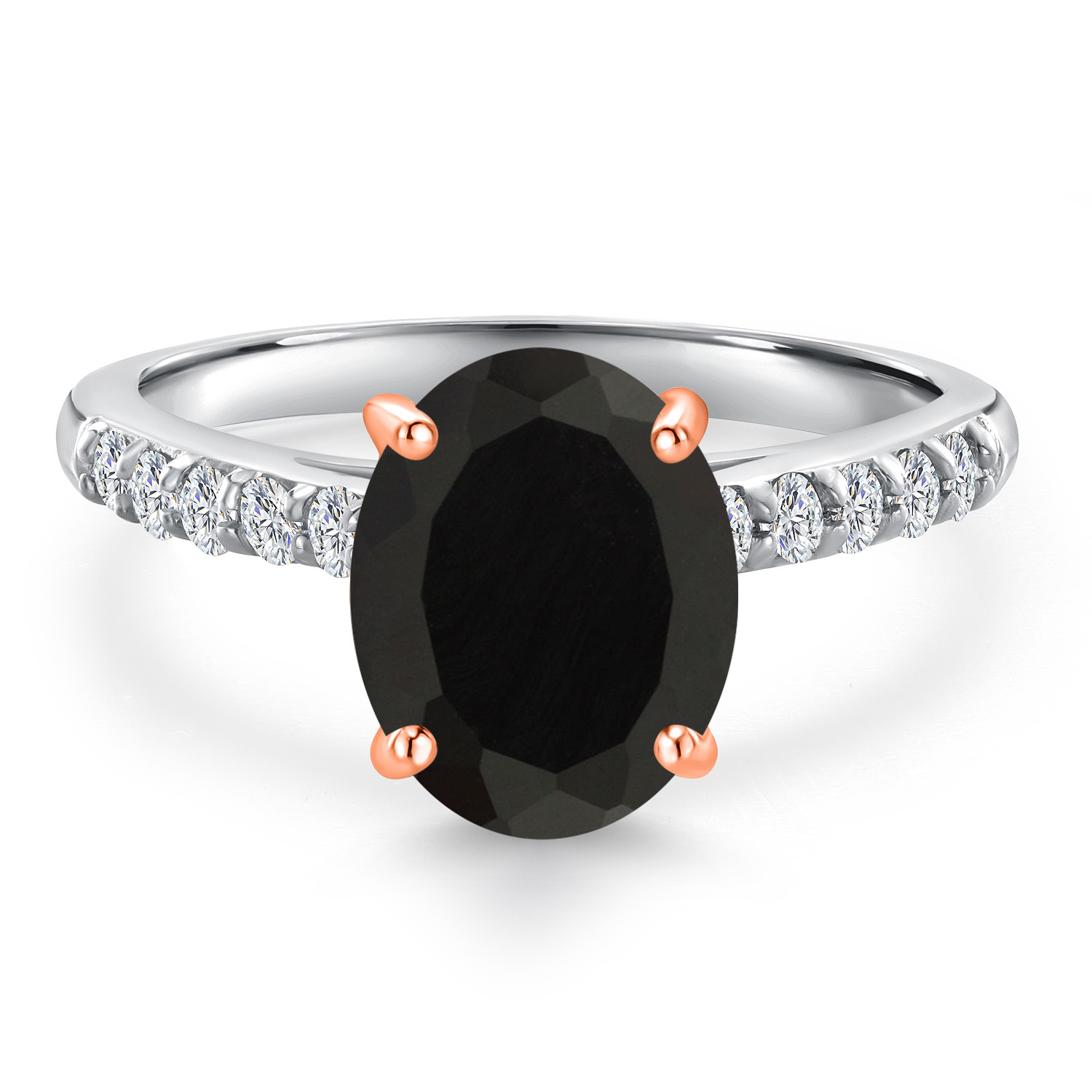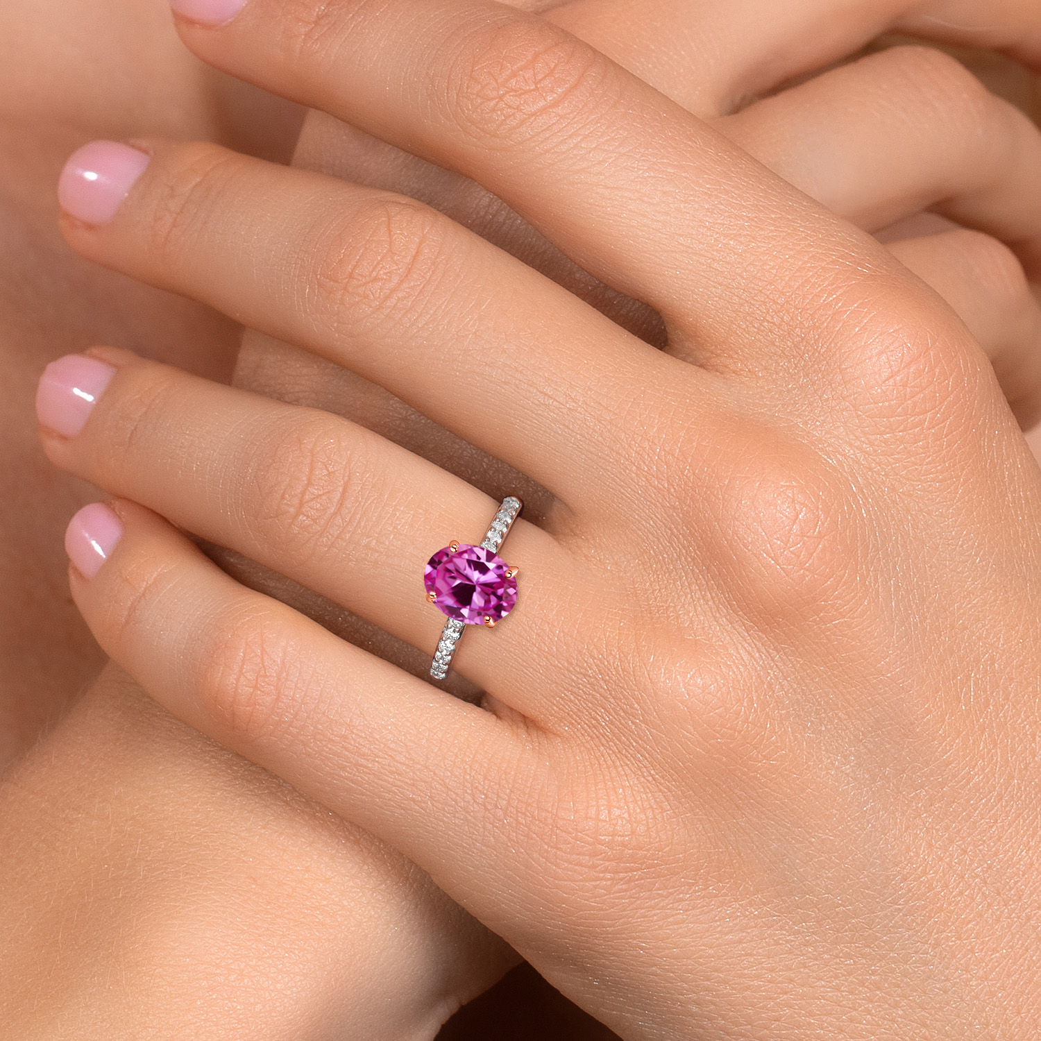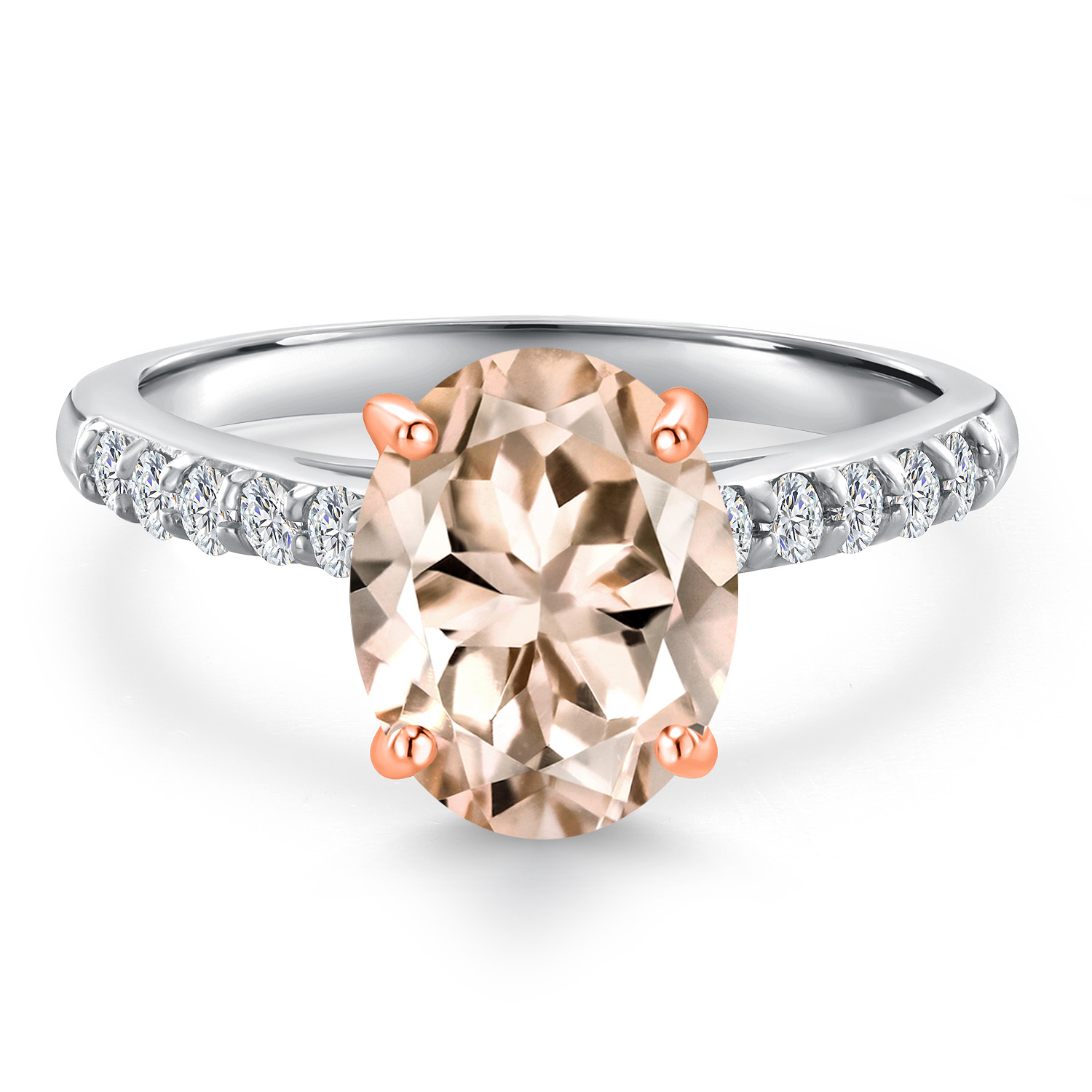 ROSE GOLD PRONG CRAFTSMANSHIP: The delicate rose gold prongs securely cradle the main gemstone, complemented by round 1.7MM white lab-grown diamond accents that add an extra layer of sparkle. These ethically sourced diamonds are expertly set to enhance the ring's overall brilliance, showcasing superior craftsmanship and attention to detail. This engagement ring embodies elegance and sophistication, making it a perfect symbol of love and commitment.