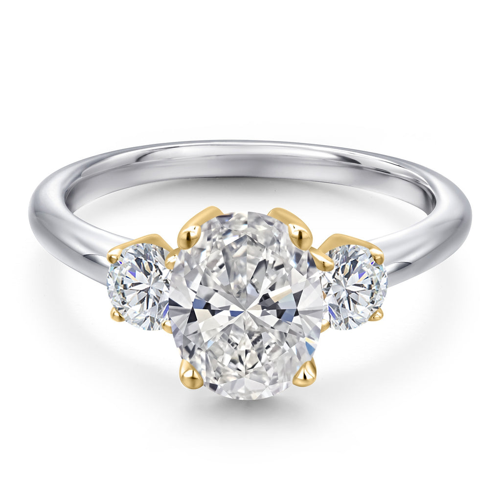 THREE-STONE BRILLIANCE: The ring showcases a captivating three-stone design, featuring a central oval diamond flanked by two round 4MM lab-grown diamonds. Each stone is meticulously set to maximize brilliance and fire, highlighting exceptional craftsmanship. The harmonious blend of shapes and sizes creates a balanced, eye-catching design that symbolizes past, present, and future, making it a meaningful choice for engagements, anniversaries, or promises.