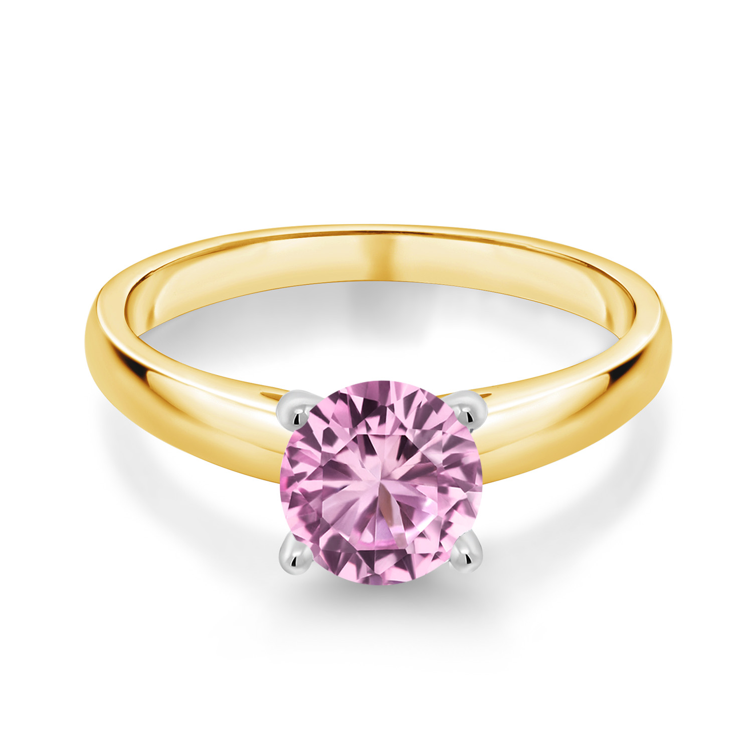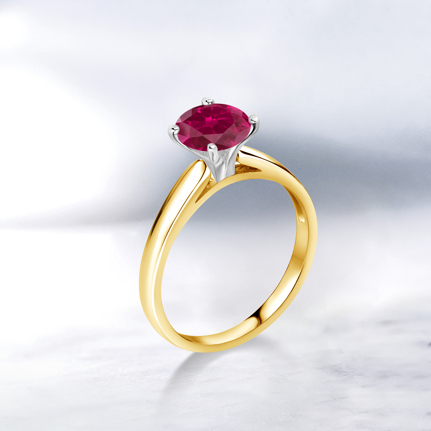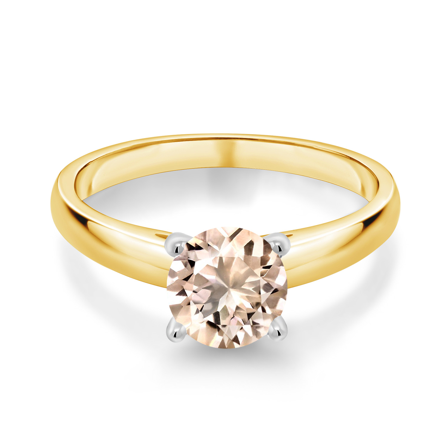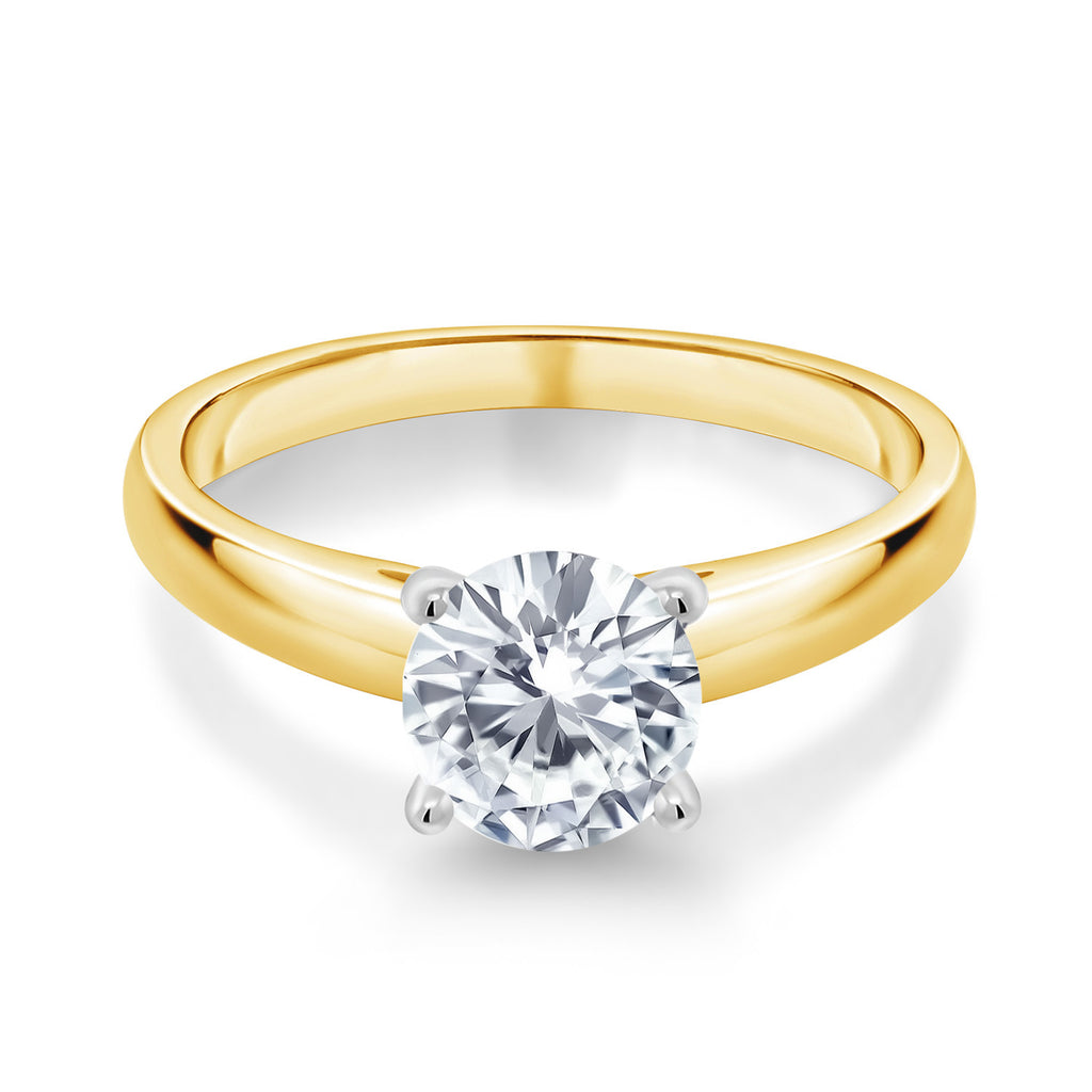 ELEGANT TWO-TONE DESIGN: A polished yellow gold band complements the white gold head, creating a striking contrast. This harmonious blend enhances the round gemstone's brilliance, adding sophistication and depth to the ring's timeless aesthetic.