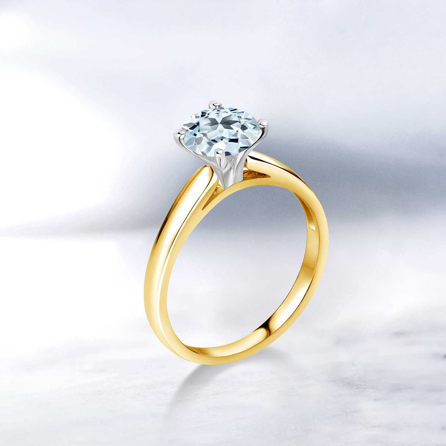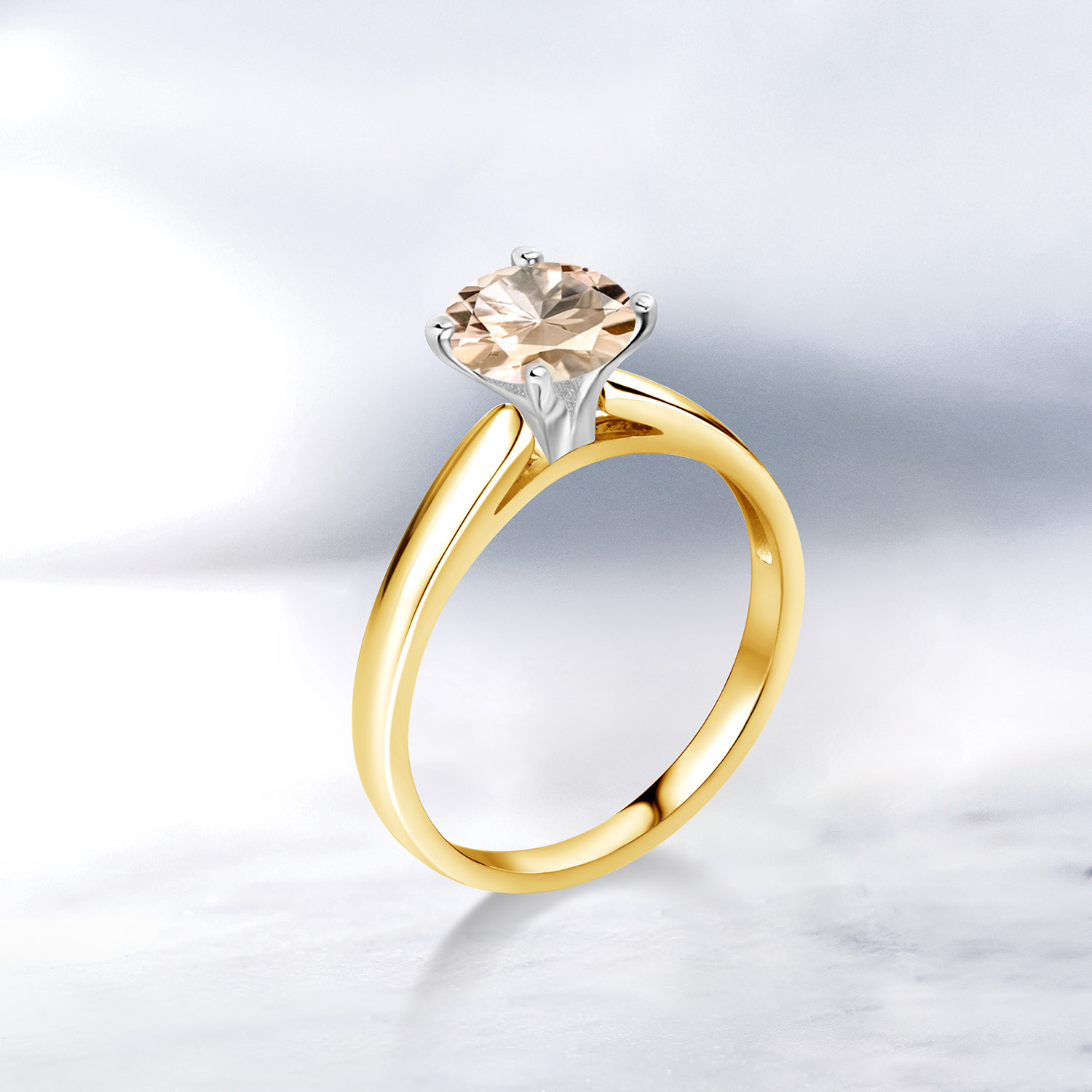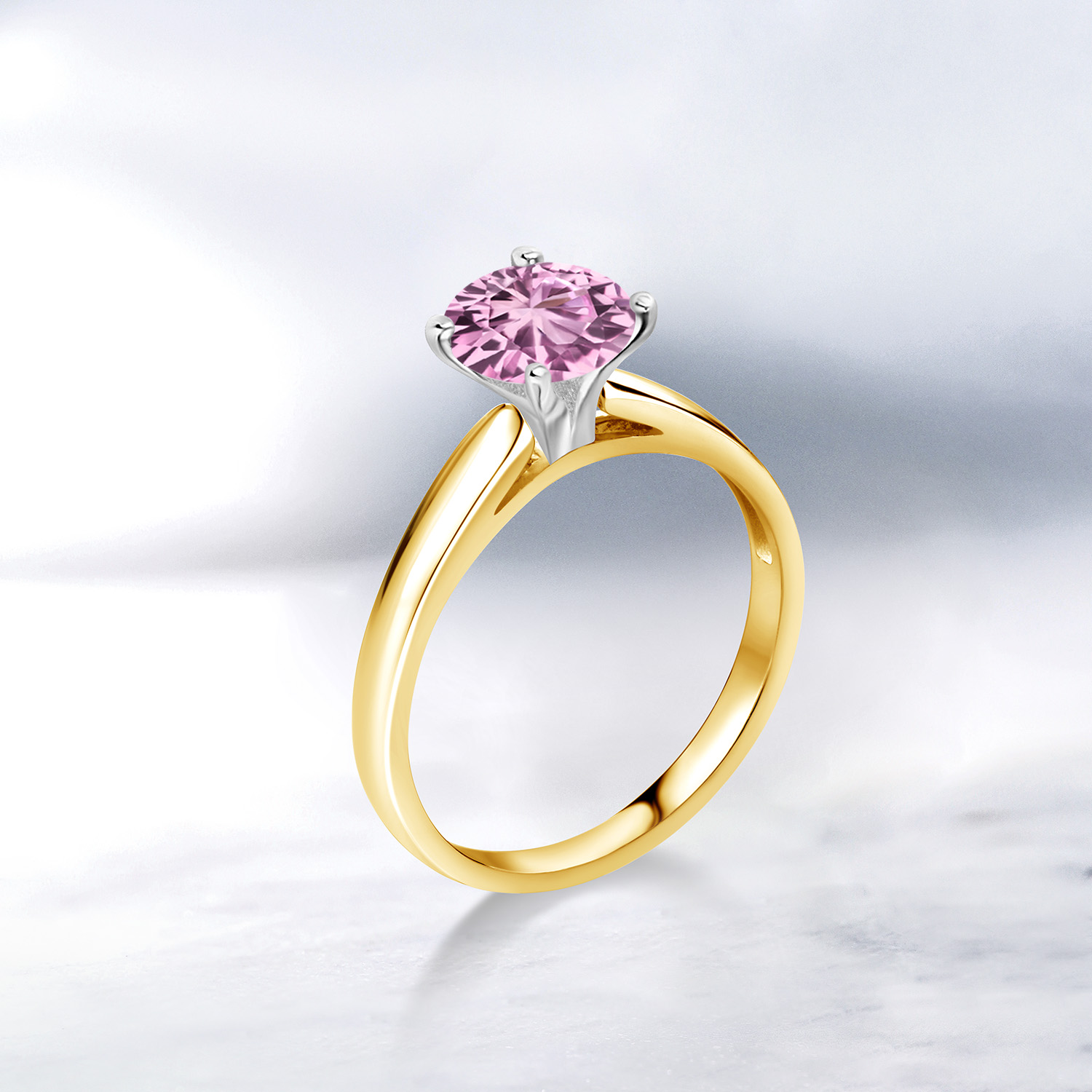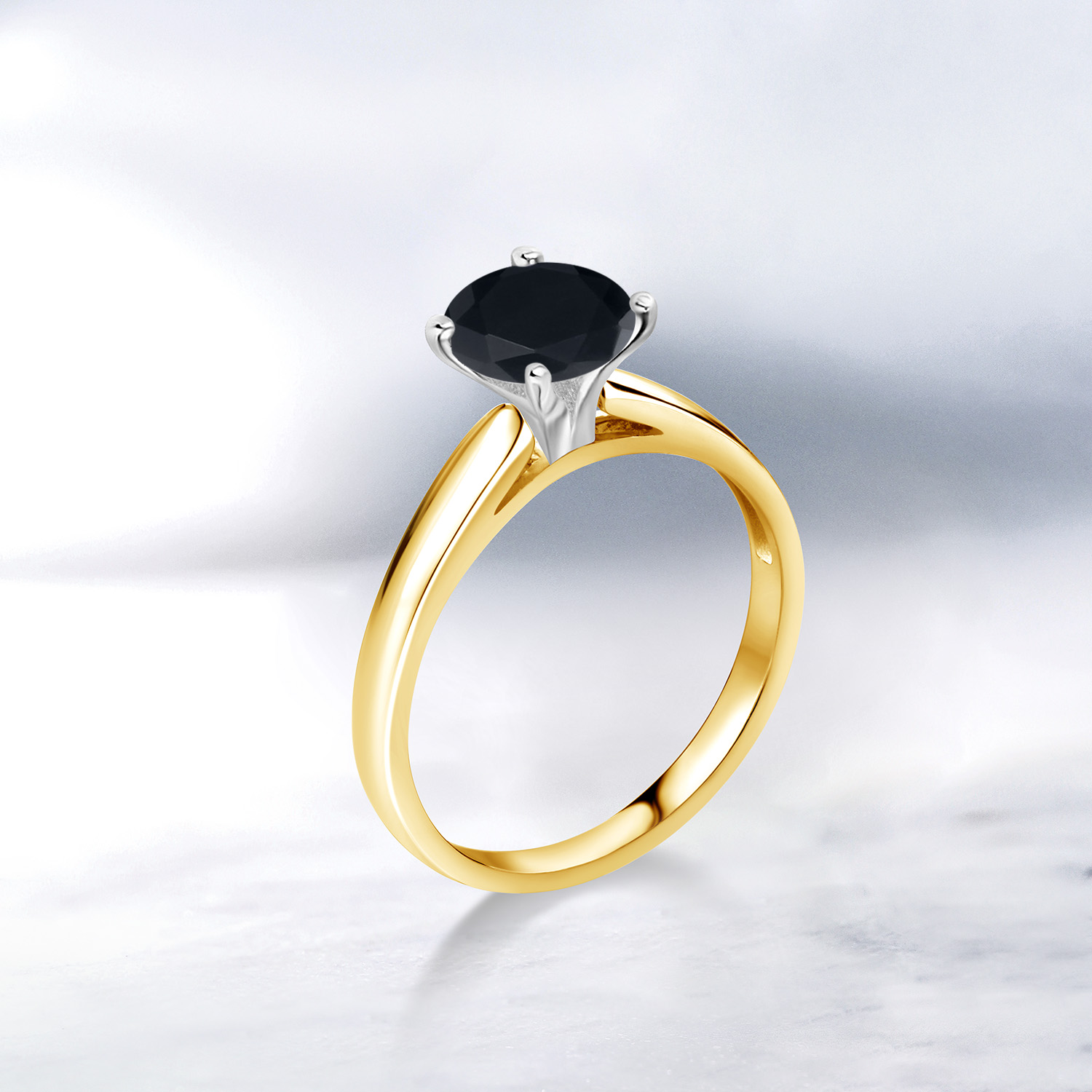 ELEGANT TWO-TONE DESIGN: A polished yellow gold band complements the white gold head, creating a striking contrast. This harmonious blend enhances the round gemstone's brilliance, adding sophistication and depth to the ring's timeless aesthetic.