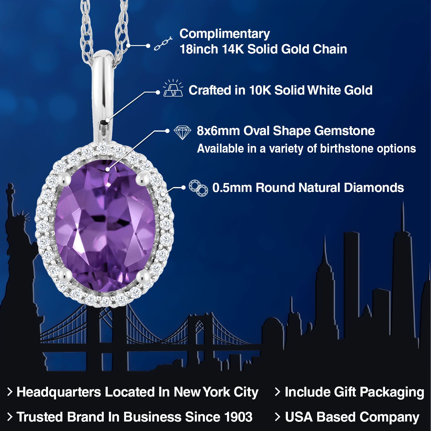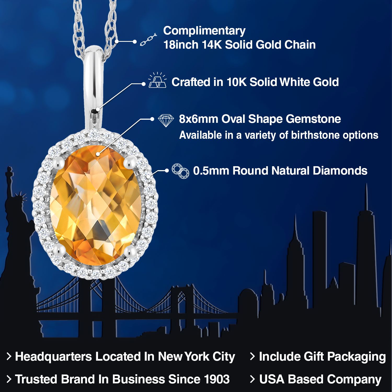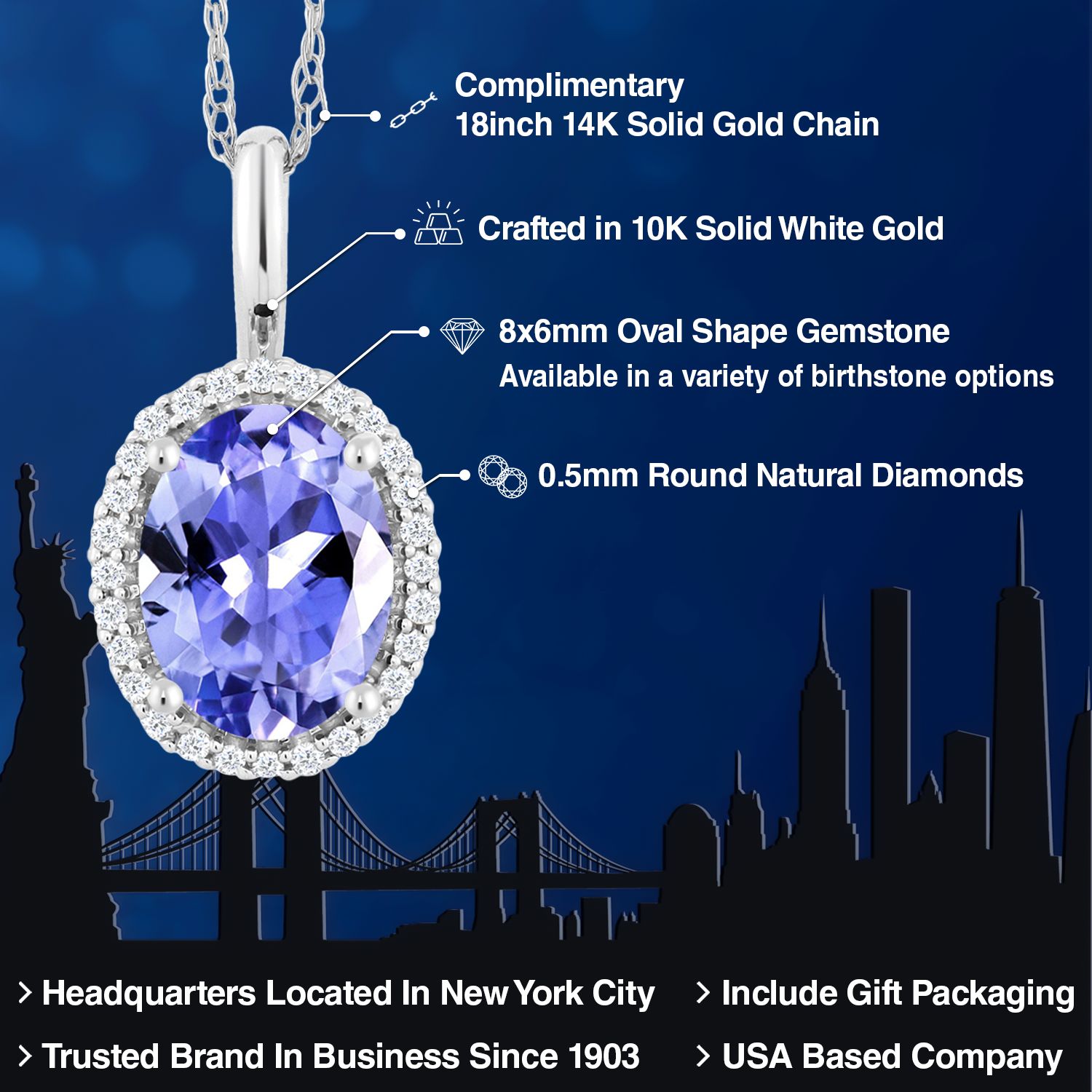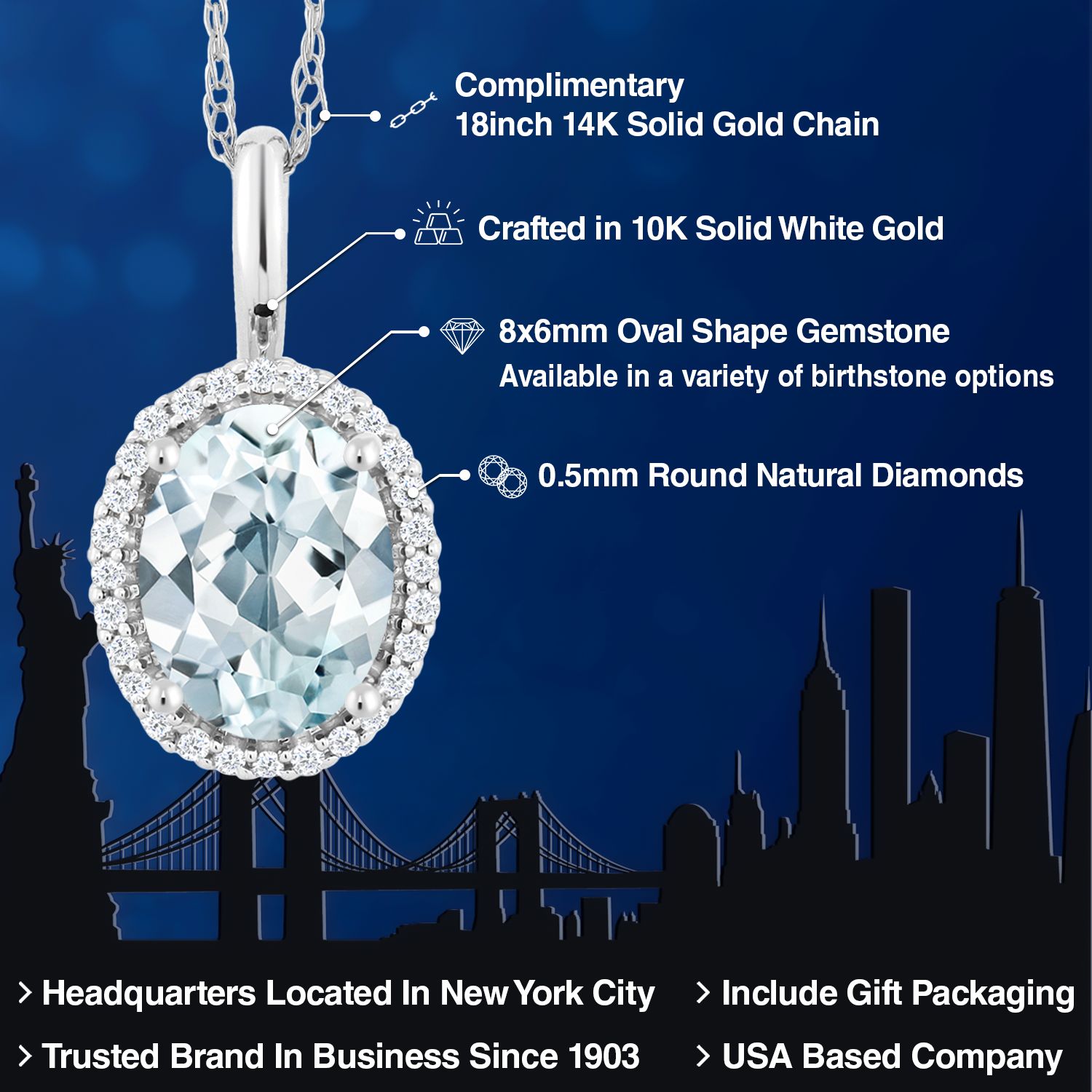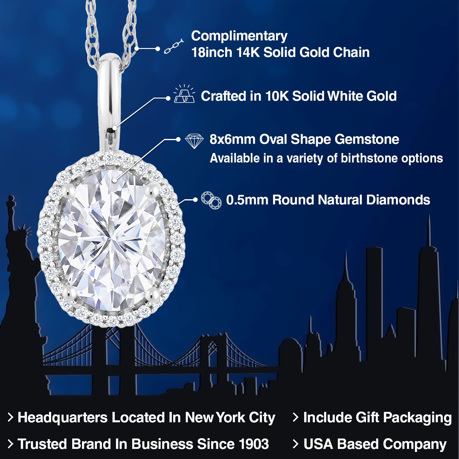 10K White Gold Oval Halo Pendant Necklace for Women | Gemstone Birthstone and Diamond | Oval 8X6MM | White Gold Necklace | 18 Inch Chain | Fine Jewelry Gifts for Her Mom Women Wife