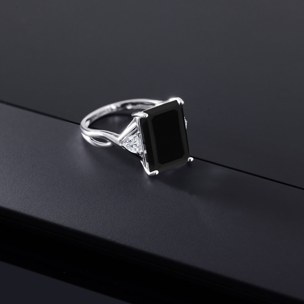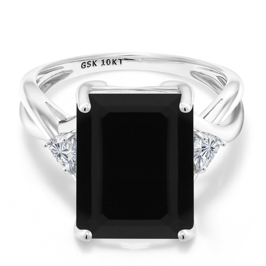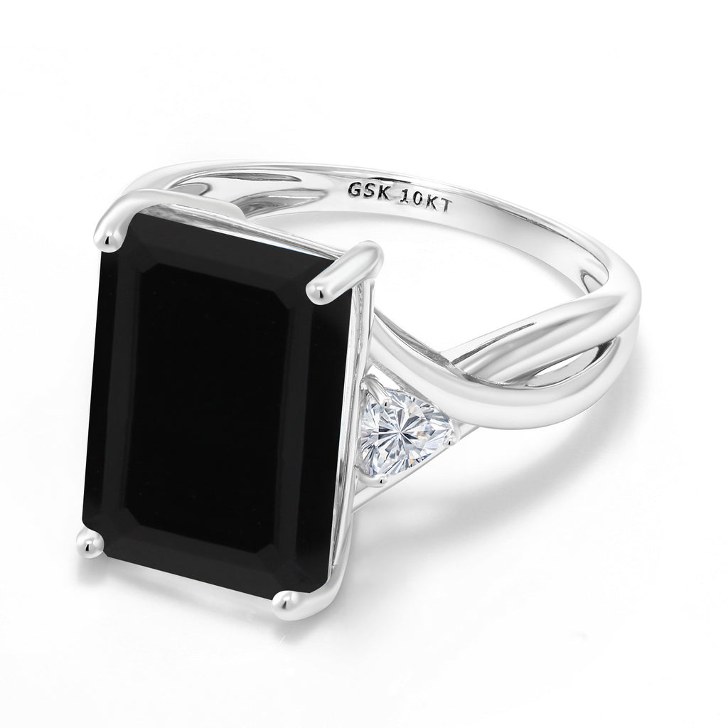 EXQUISITE CRAFTSMANSHIP AND BOLD DESIGN: This striking engagement ring features a 14X10MM emerald-cut black onyx as the centerpiece, accented by 4MM trillion-cut lab grown diamonds, totaling 7.04 Cttw. Set in luxurious 10K White Gold, this ring combines modern elegance with a unique and bold style that sets it apart from traditional designs.