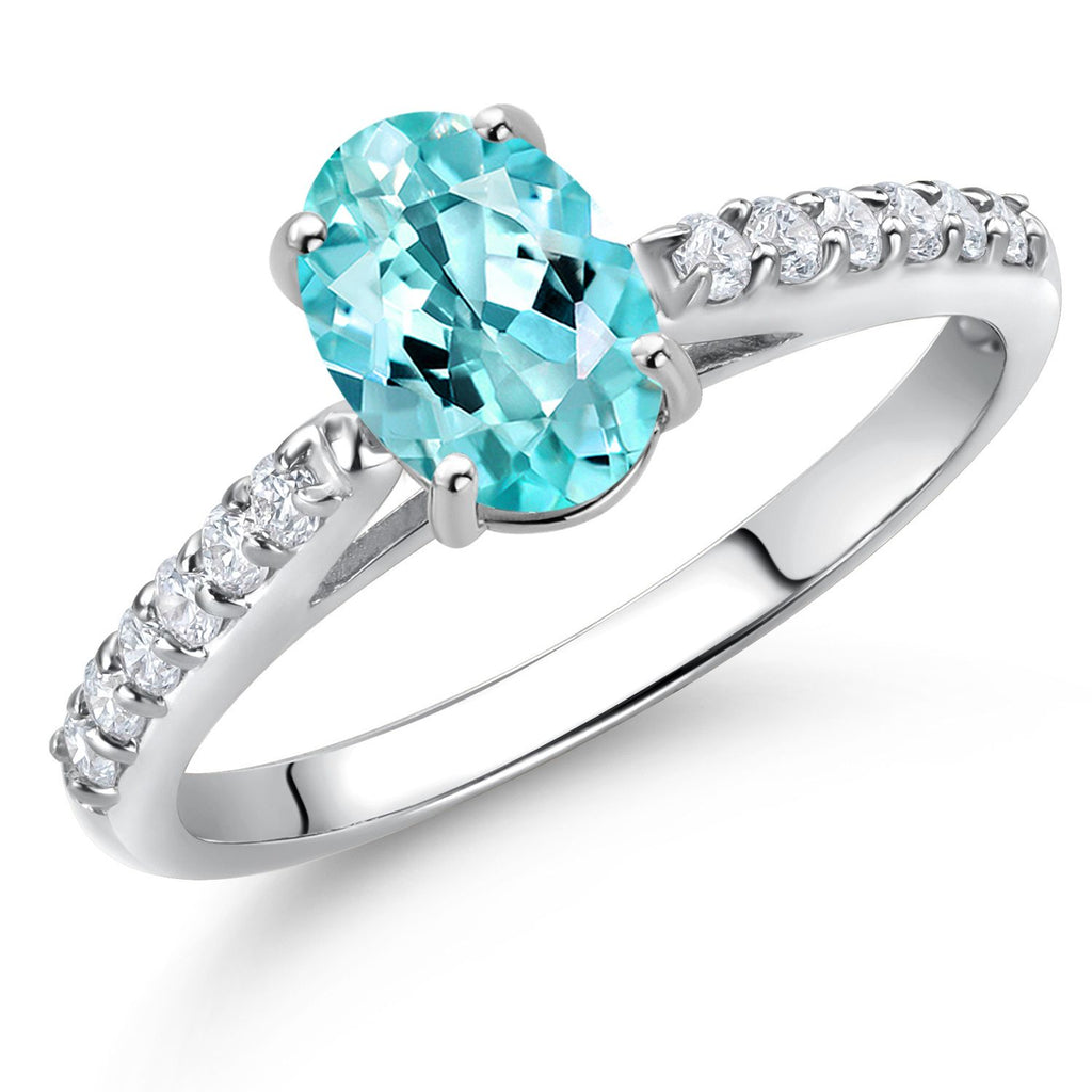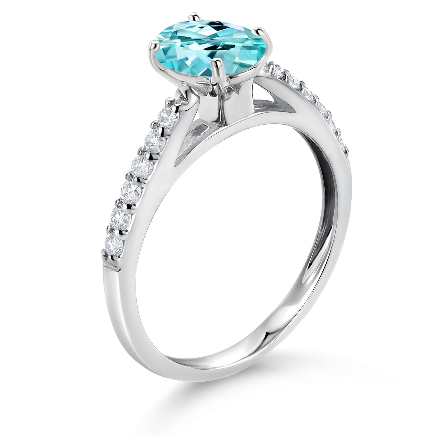 MEASUREMENTS: 8x6mm Oval Blue Apatite, 1.5x1.5mm Round E - F Lab Grown Diamond. Total Carat Weight is 1.38 cttw