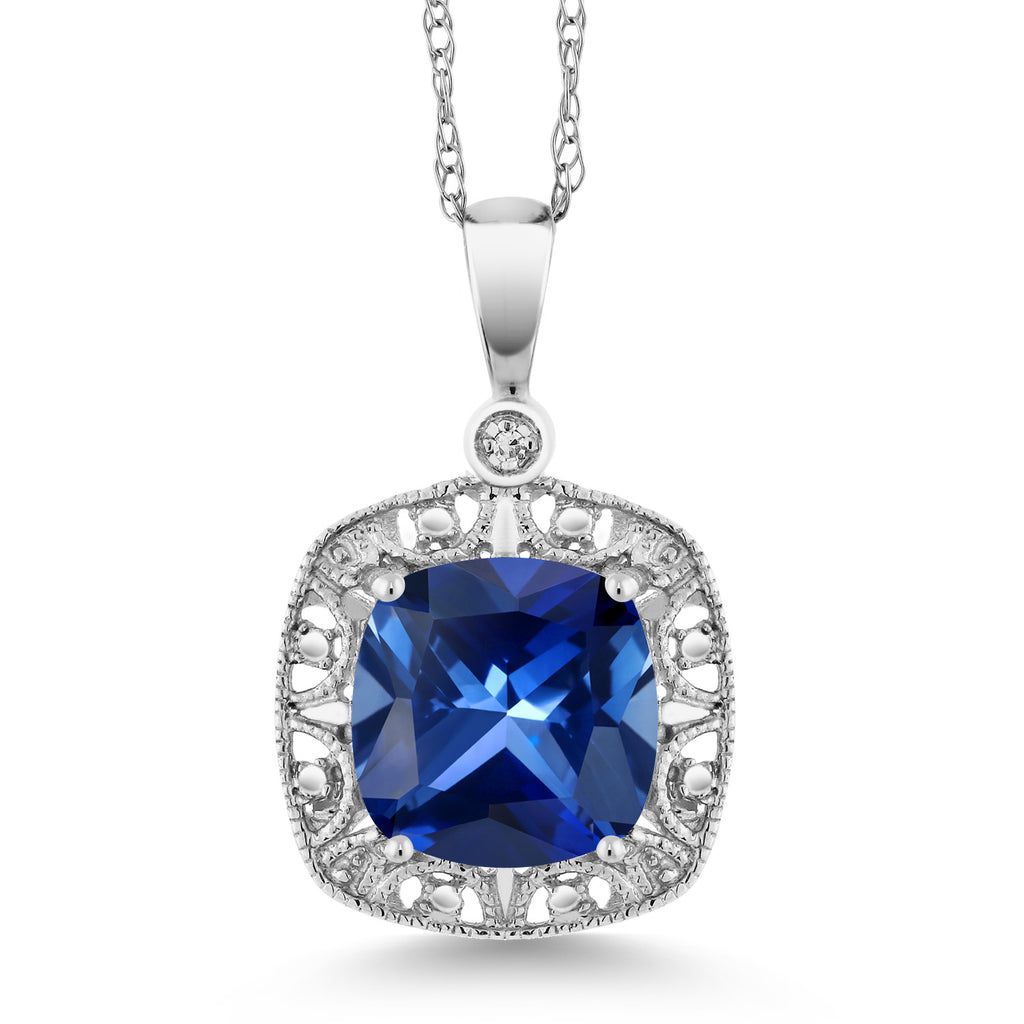 RADIANT DESIGN WITH LUXURIOUS MATERIALS: This pendant showcases a breathtaking Blue Created Sapphire (2.50 Cttw, Cushion 8MM) complemented by sparkling Diamond Accents, all set in premium 10K White Gold for timeless elegance. Perfect for anyone seeking a stunning Blue Sapphire Necklace.