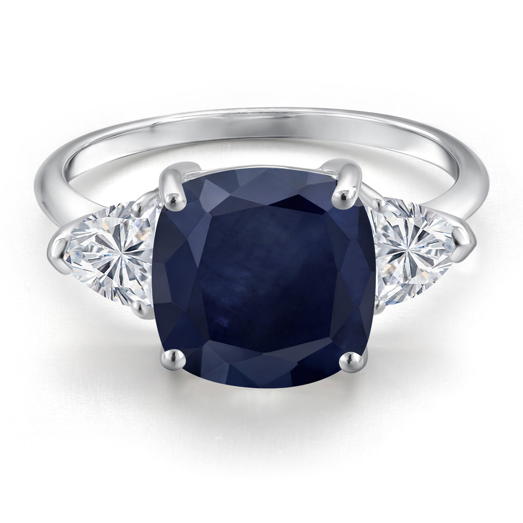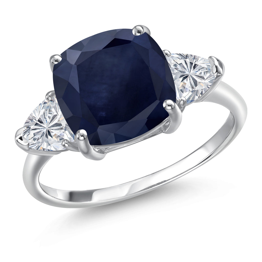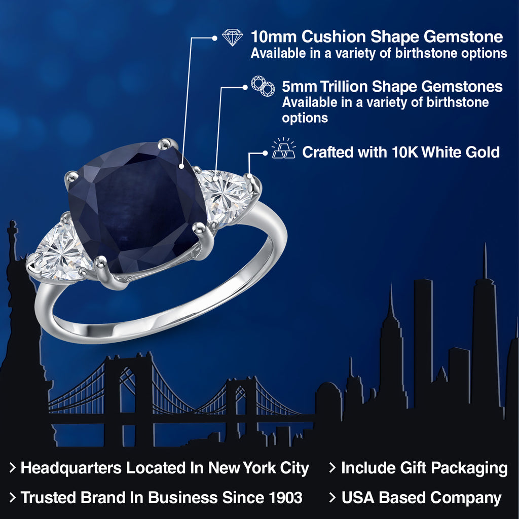 LUXURIOUS STATEMENT DESIGN: This 10K white gold engagement ring features a magnificent 5.34 Cttw combination of a 10MM cushion-cut Blue Sapphire centerpiece and two 5MM trillion-cut Lab Grown Diamonds, creating a bold and sophisticated look.
