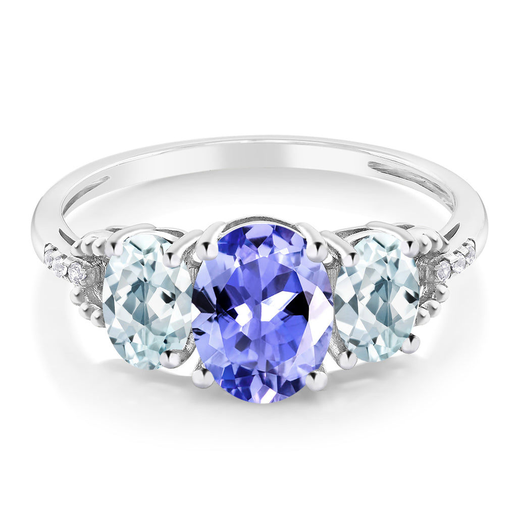 10K White Gold Blue Tanzanite Sky Blue Aquamarine & Diamond Accent 3-Stone Engagement Ring | 2.07 Cttw | Three Stone Wedding Engagement Anniversary Promise Ring For Women