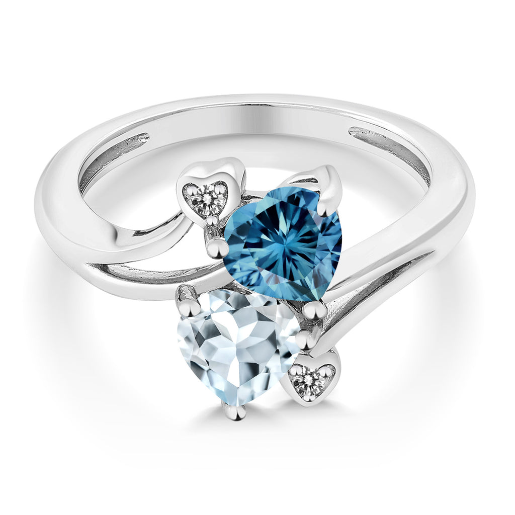MEASUREMENTS: 6x6mm Heart Shape Coated Persian Blue Moissanite, 6x6mm Heart Shape Heat-Treated Sky Blue Aquamarine1.5, x, 1.5, mm Round White Diamond. Total Carat Weight is 1.56 cttw