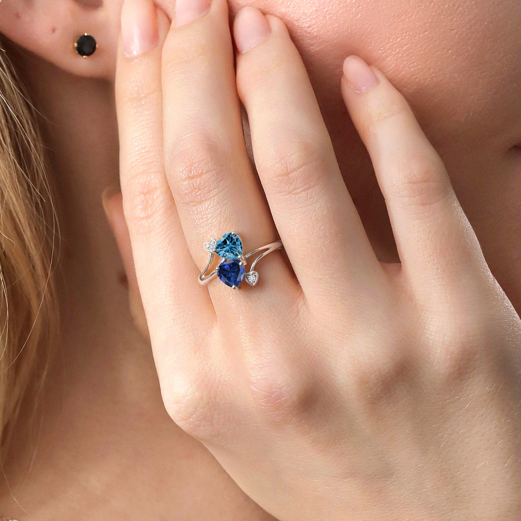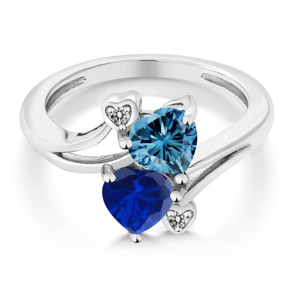 MEASUREMENTS: 6x6mm Heart Shape Coated Persian Blue Moissanite, 6x6mm Heart Shape Heat-Treated Blue Created Sapphire1.5, x, 1.5, mm Round White Diamond. Total Carat Weight is 1.63 cttw